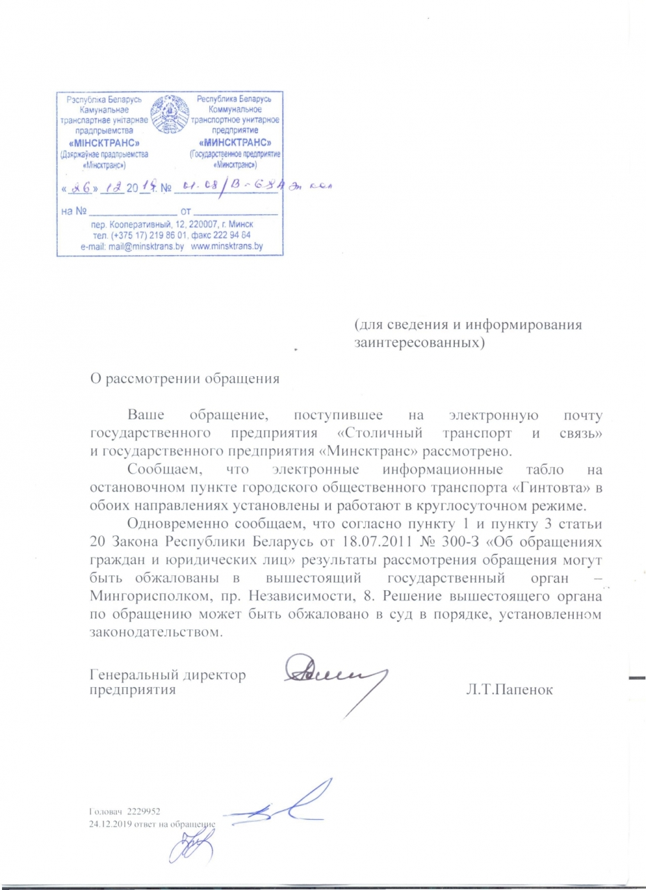 Мы, подписавшиеся под данным обращением, просим произвести установку электронного табло на остановочных пунктах "Гинтовта" в микрорайоне "Уручье-6".