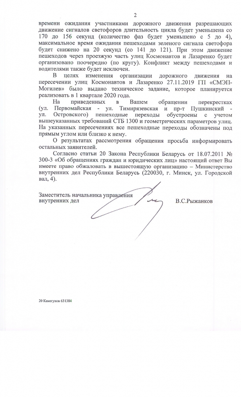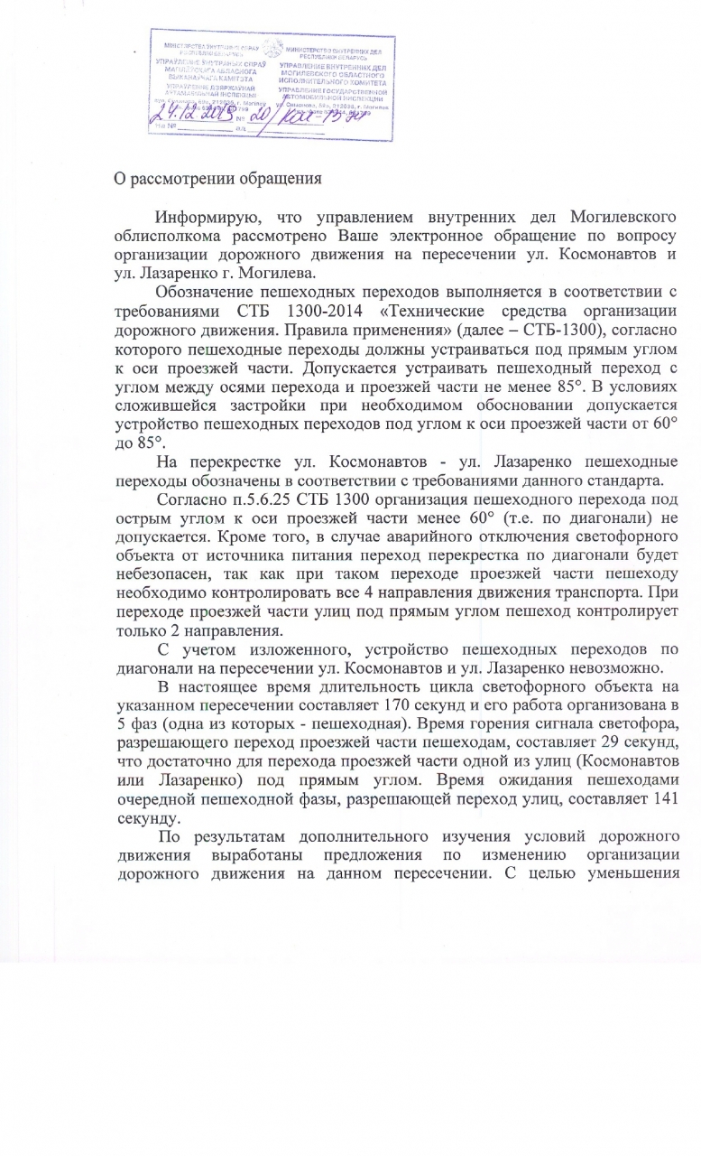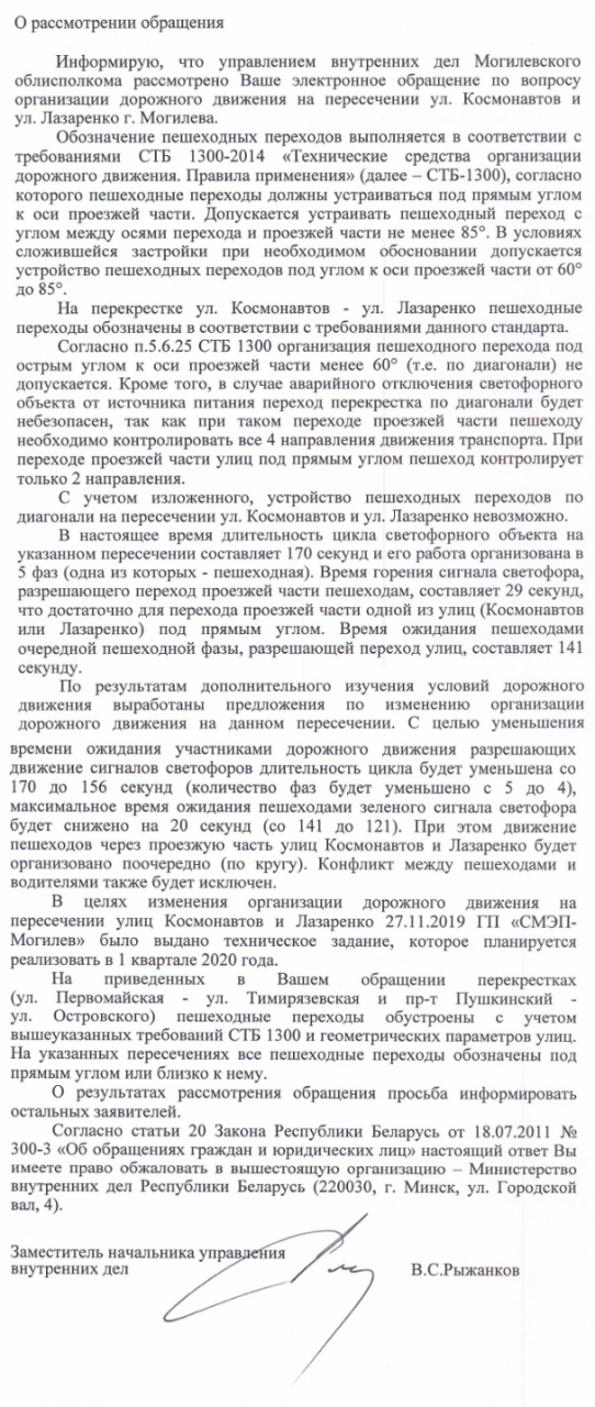 26 ноября 2019 получен ответ (копия прилагается) на электронное обращение граждан по вопросу разрешения пересечения перекрёстка ул.Лазаренко и ул.Космонавтов в Могилёве по диагонали.