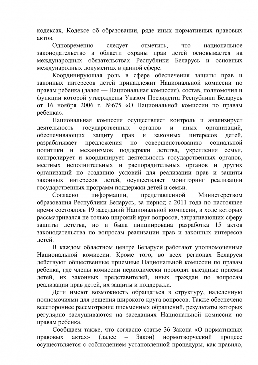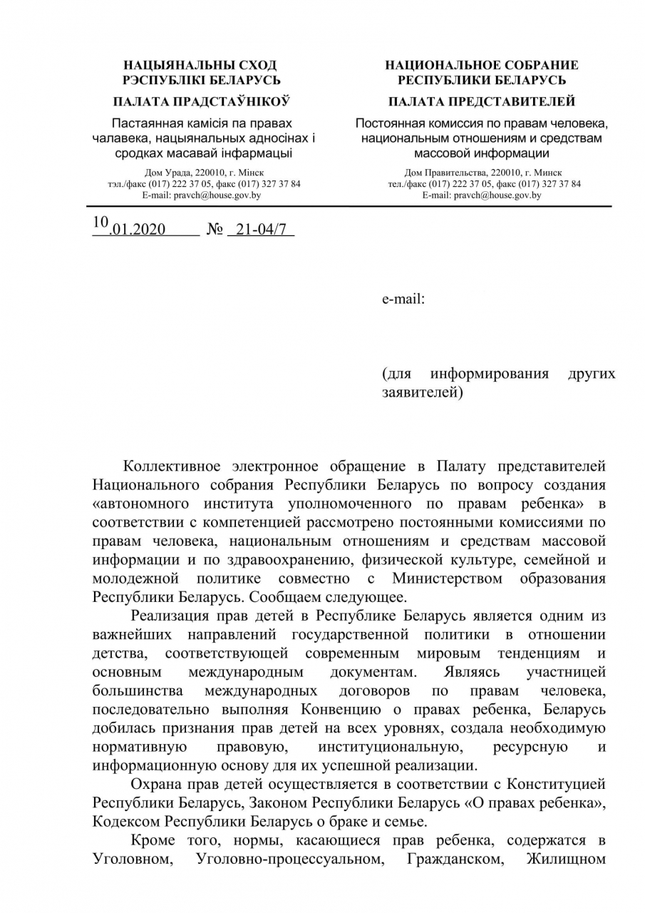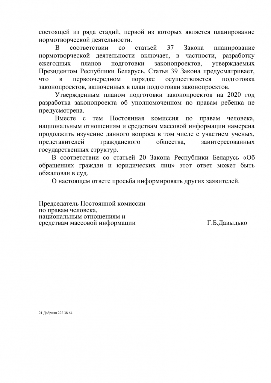 На основании изложенного просим в 2020 году приступить к разработке проекта создания в Беларуси института уполномоченного по правам ребёнка.