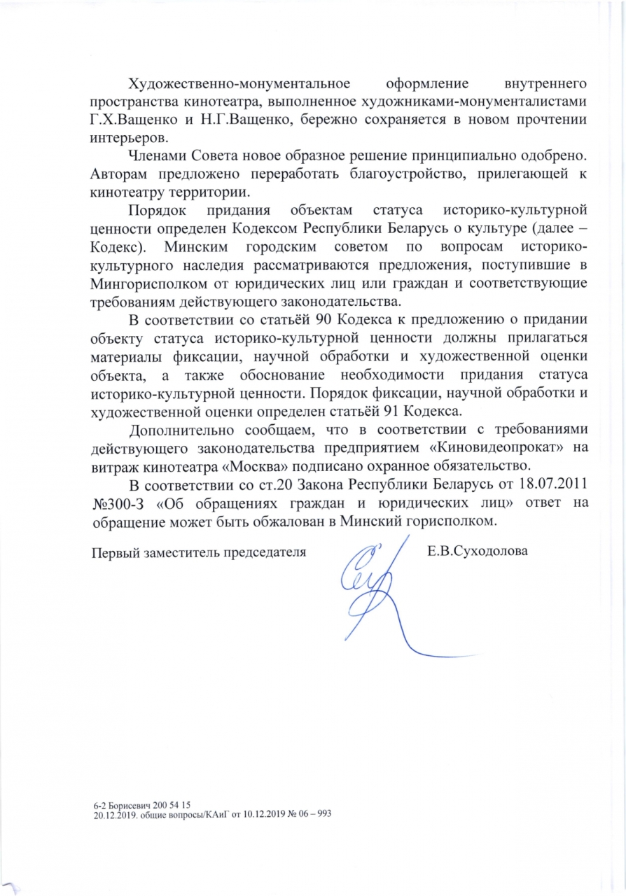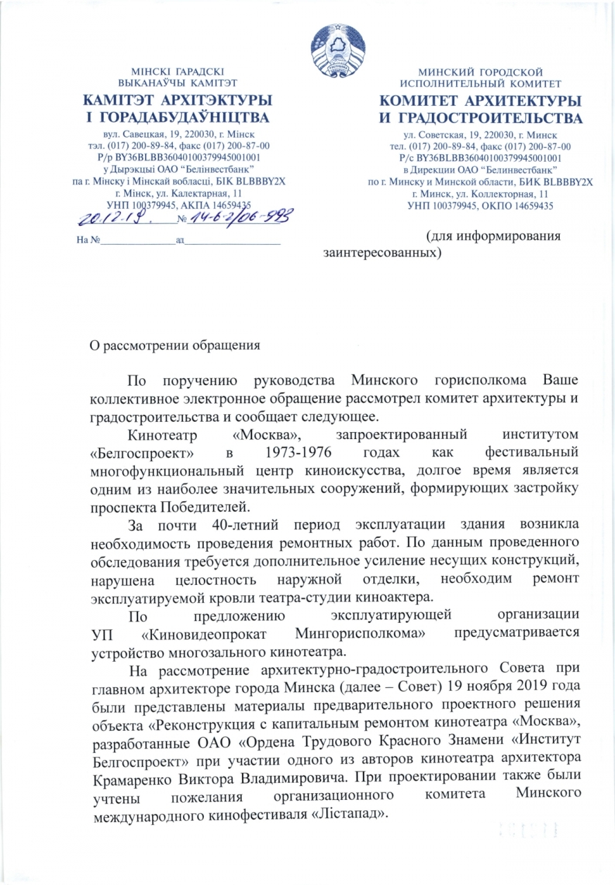 Членами архитектурно-градостроительного Совета при главном архитекторе г.Минска новое образное решение проектное решение "Реконструкция с капитальным ремонтом кинотеатра "Москва" принципиально одобрено. Авторам проекта предложено проработать благоустройство прилегающей к кинотеатру территории.