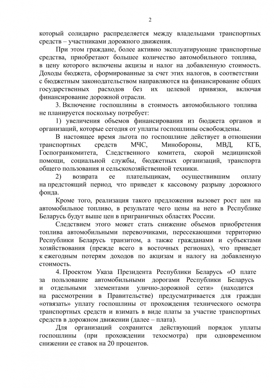 Включение госпошлины в стоимость автомобильного топлива не планируется. Проект Указа Президента «О плате за пользование автомобильными дорогами Республики Беларусь и отдельными элементами улично-дорожной сети» (находится на рассмотрении в Правительстве) предусматривает для граждан «отвязать» уплату госпошлины от прохождения технического осмотра транспортных средств и взимать в виде платы за участие транспортных средств в дорожном движении.