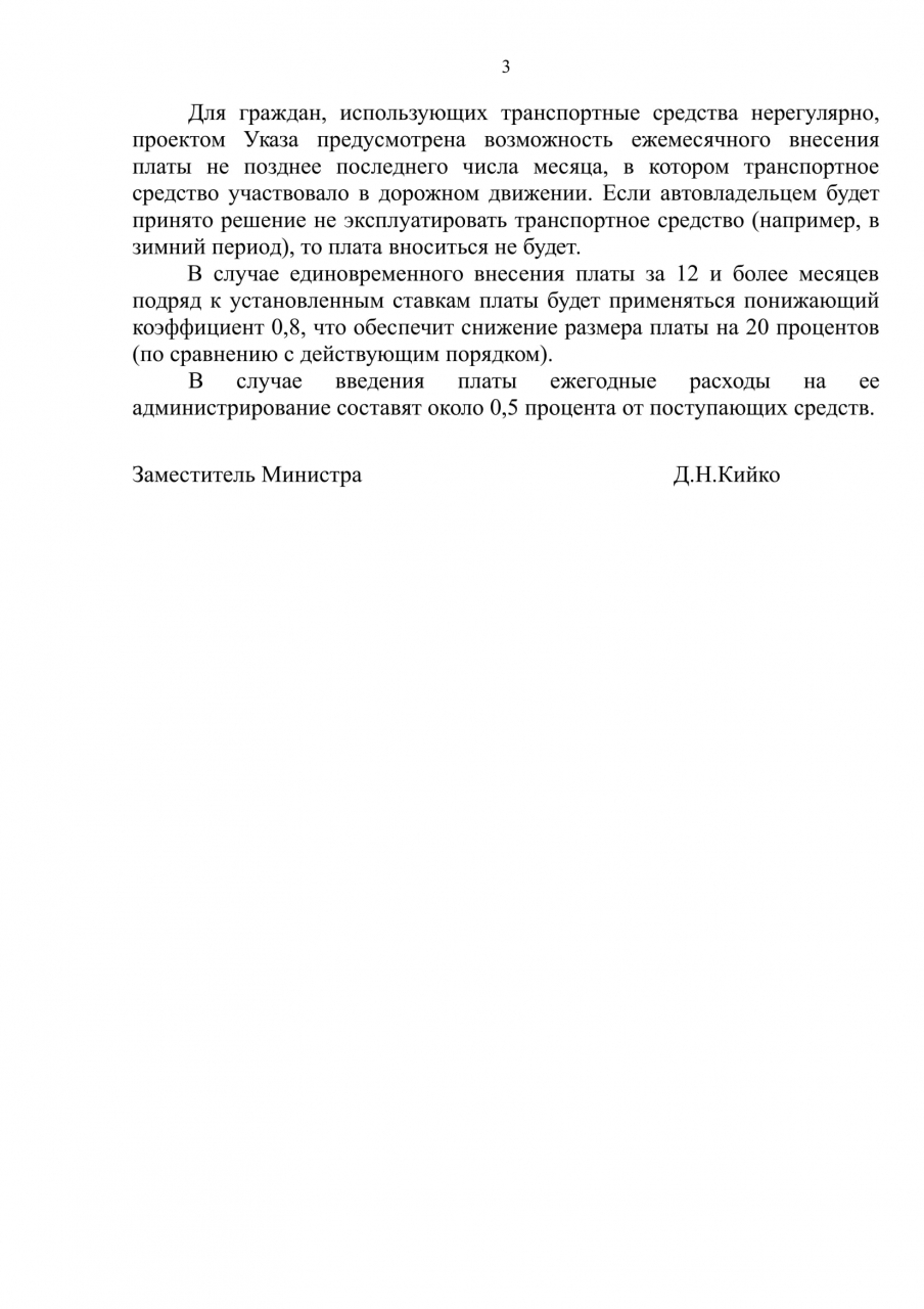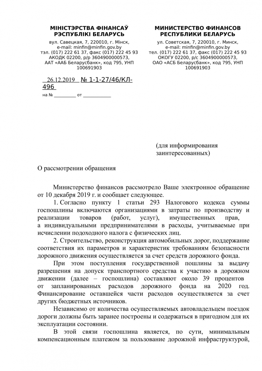 На основании Положения о Министерстве финансов, утвержденного постановлением Совета Министров Республики Беларусь от 31.10.2001 N 1585, которым установлено, что Минфин анализирует влияние действующей налоговой системы на обеспечение доходной части республиканского бюджета и на финансовое состояние юридических лиц, проводит работу по совершенствованию налогового законодательства Республики Беларусь, просим предать общественности расчеты всех вариантов по включению государственной пошлины за выдачу разрешения на допуск транспортного средства к участию в дорожном движении (далее - дорожный сбор) в стоимость топлива.
