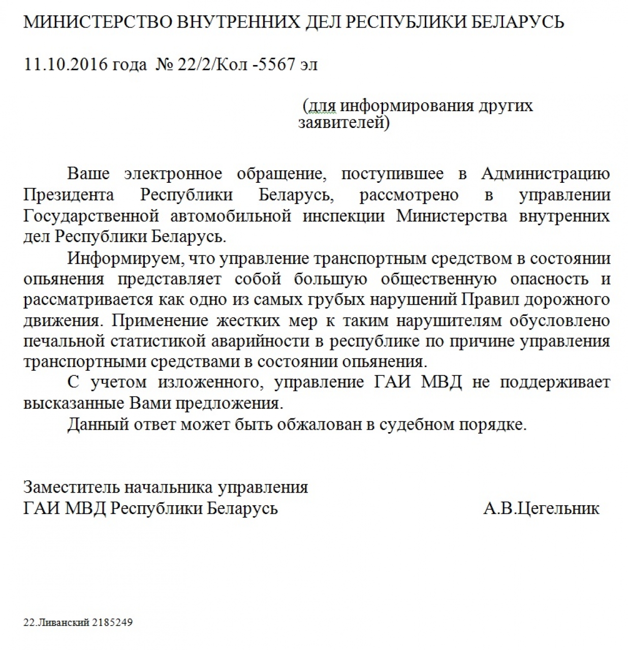 МВД не поддерживает инициативу, поскольку управление транспортным средством в состоянии опьянения представляет собой большую общественную опасность и рассматривается как одно из самых грубых нарушений Правил дорожного движения. Применение жестких мер к таким нарушителям обусловлено печальной статистикой аварийности в республике по причине управления транспортными средствами в состоянии опьянения.