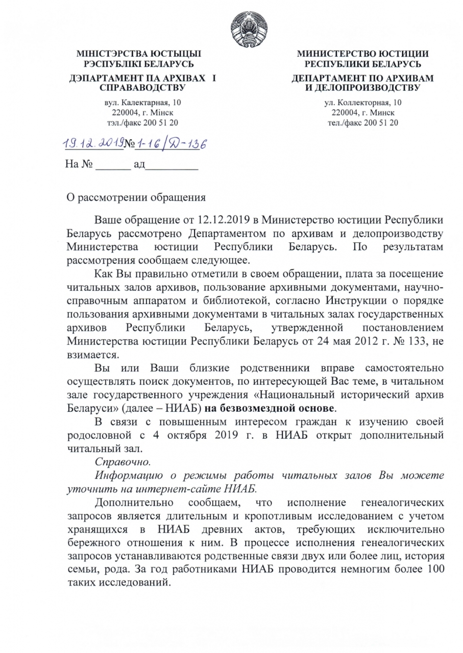 Учитывая, что Департамент по архивам и делопроизводству входит в состав Министерства юстиции Республики Беларусь, просим рассмотреть вопрос о том, чтобы белорусам, проживающим на территории РБ постоянно и интересующимися своими предками, предоставили возможность бесплатного пользования архивом и узнать свою родословную.