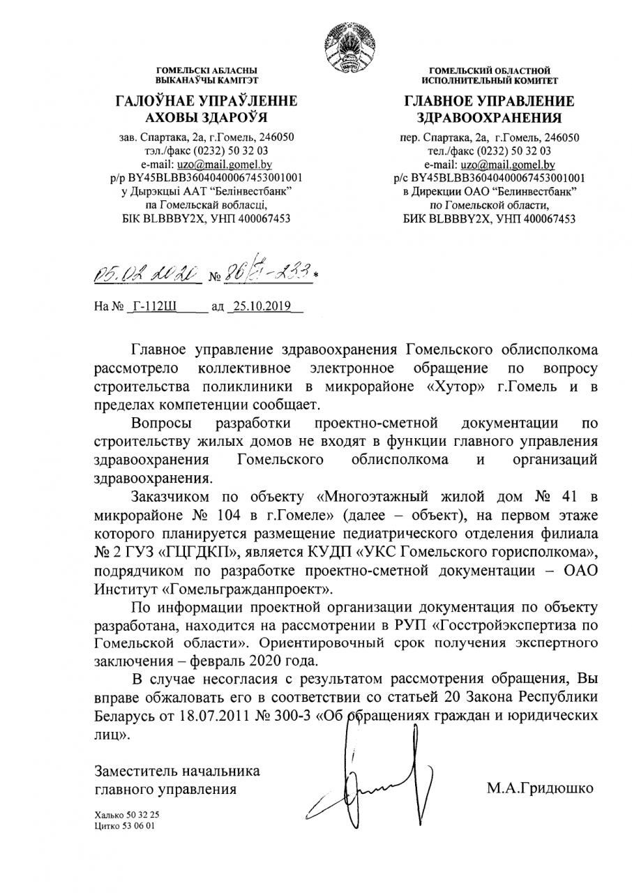 22 ноября 2019 нами среди прочих получен ответ ГУ "Гомельская центральная городская детская поликлиника", копия прилагается, на электронное обращение о строительстве поликлинике в гомельском микрорайоне "Хутор". Указанный ответ мы считаем не соответствующим требованиям законодательства в части полного, всестороннего и объективного рассмотрения обращений и направления мотивированных и обоснованных ответов гражданам по причине того, что и.о. главного врача учреждения Порфененко Л.А. не указаны сроки разработки проектно-сметной документации по объекту " Многоэтажный жилой дом № 41 в микрорайоне № 104 в г. Гомеле" с размещением на первом этаже педиатрического отделения. Таким образом, просим обеспечить надлежащее рассмотрение обращения.