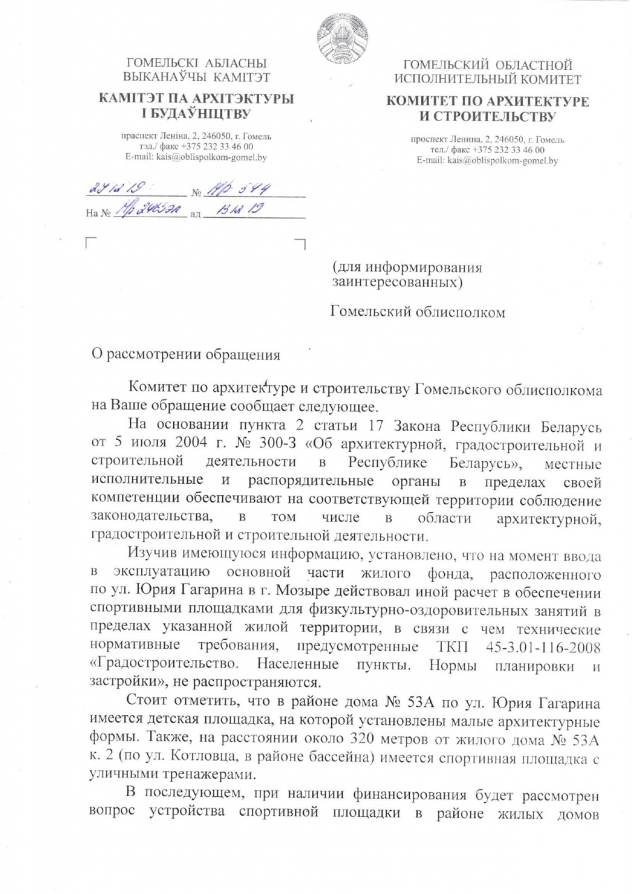27 ноября 2019 года получен ответ Мозырского райисполкома (копия прилагается), в котором не содержится информация по восстановлению нарушенных прав заявителей на занятие физической культурой и спортом, а именно: были проигнорированы приведенные в обращении нормы, законы и выдержка из программы социально-экономического развития Мозырского района.