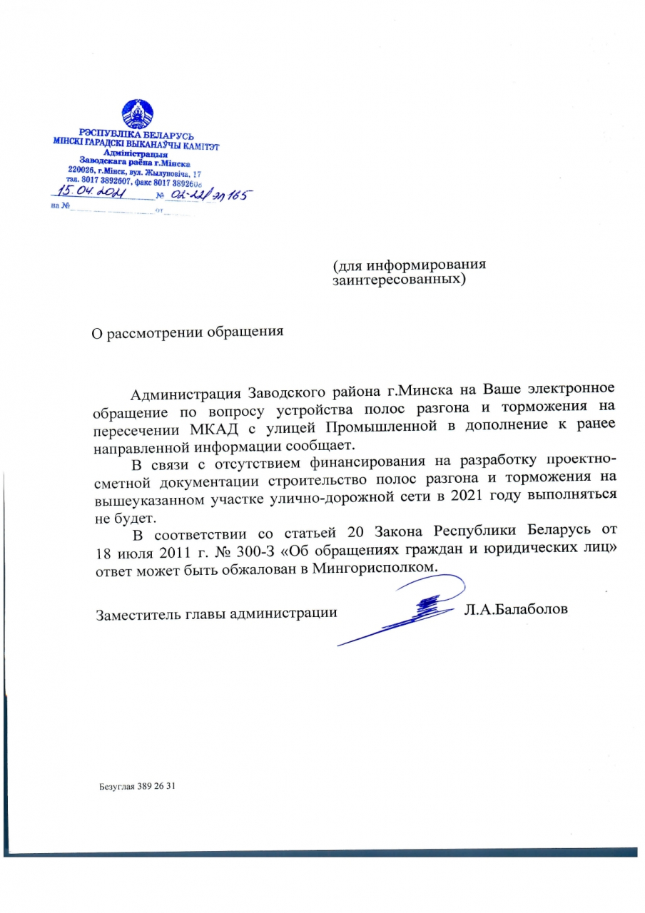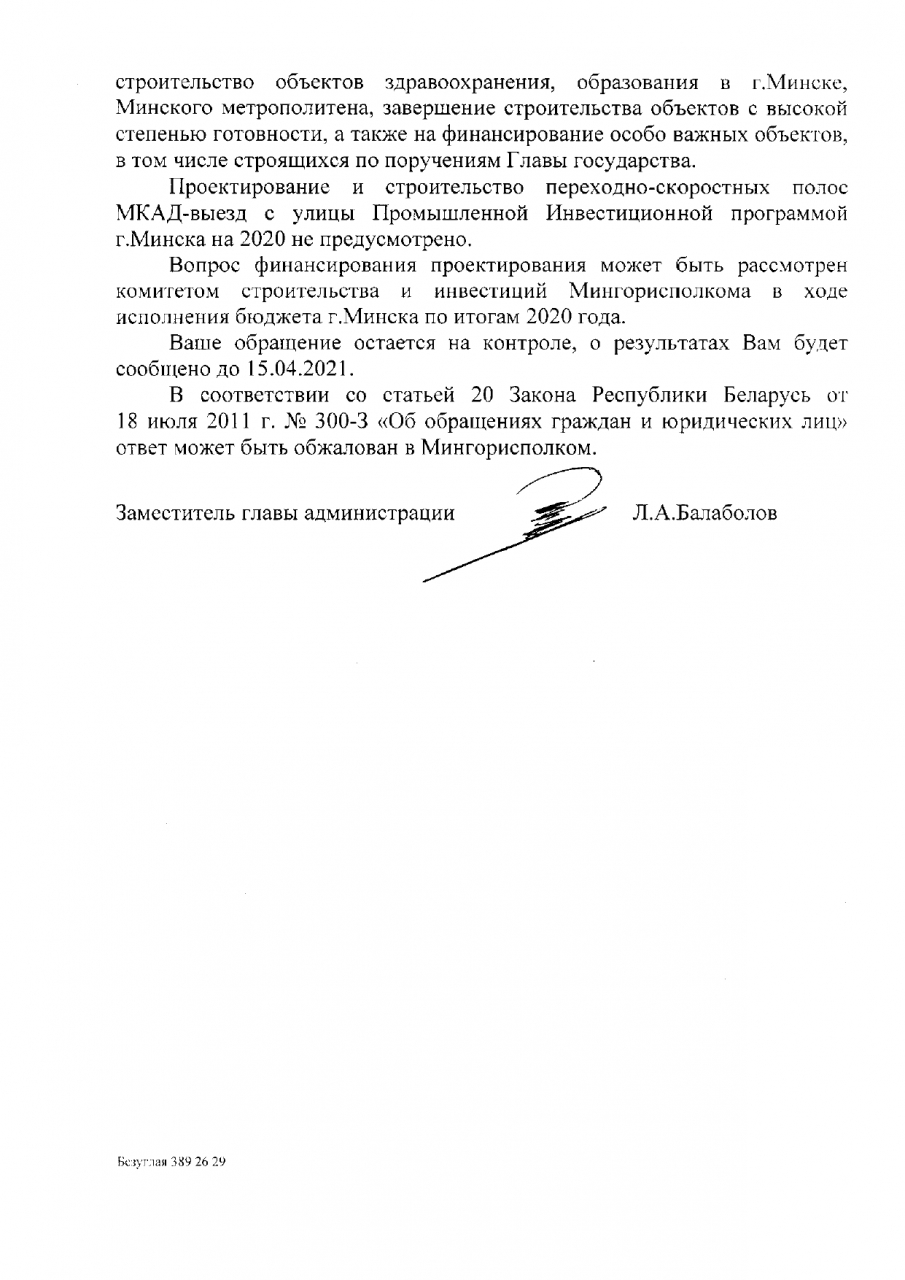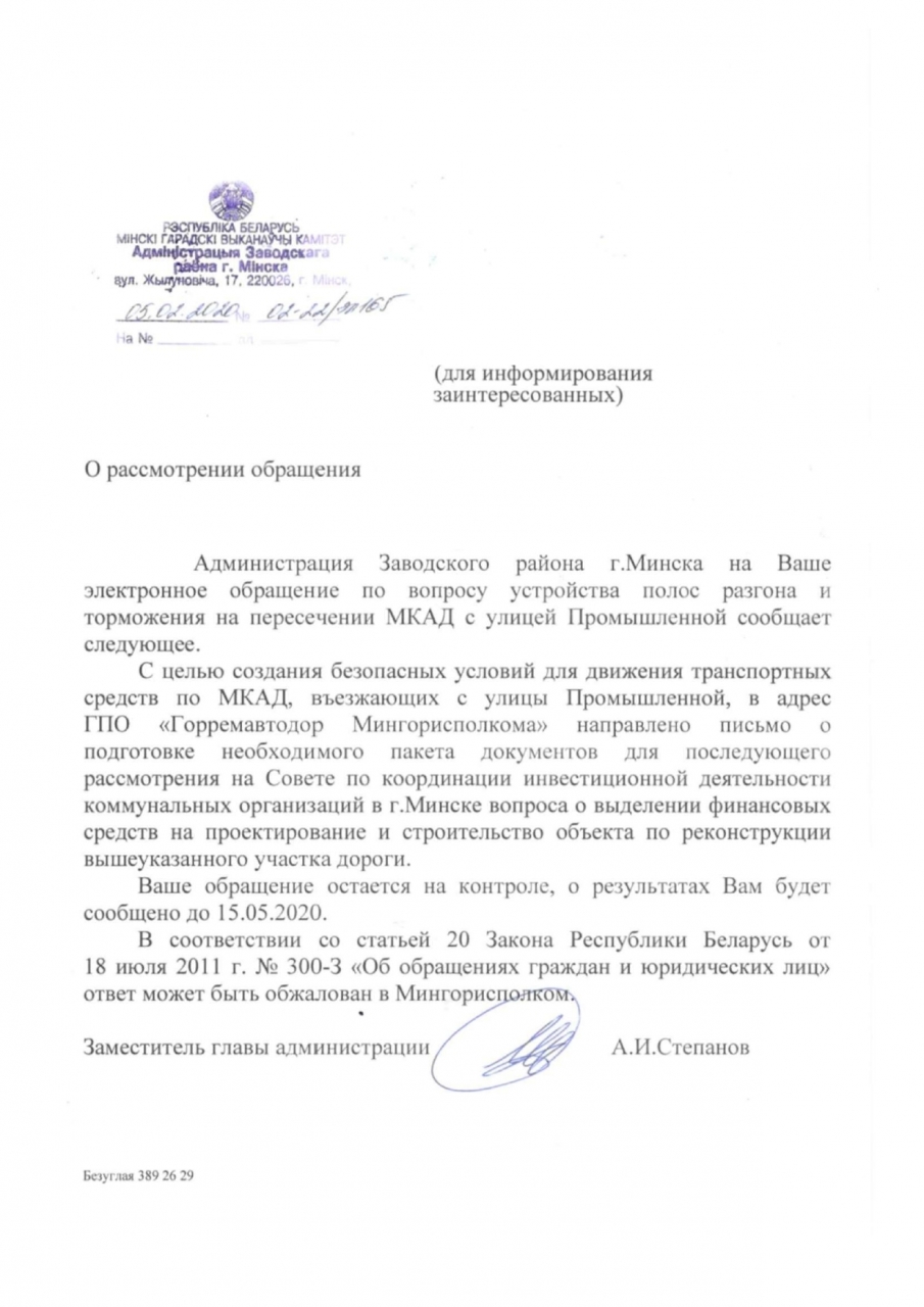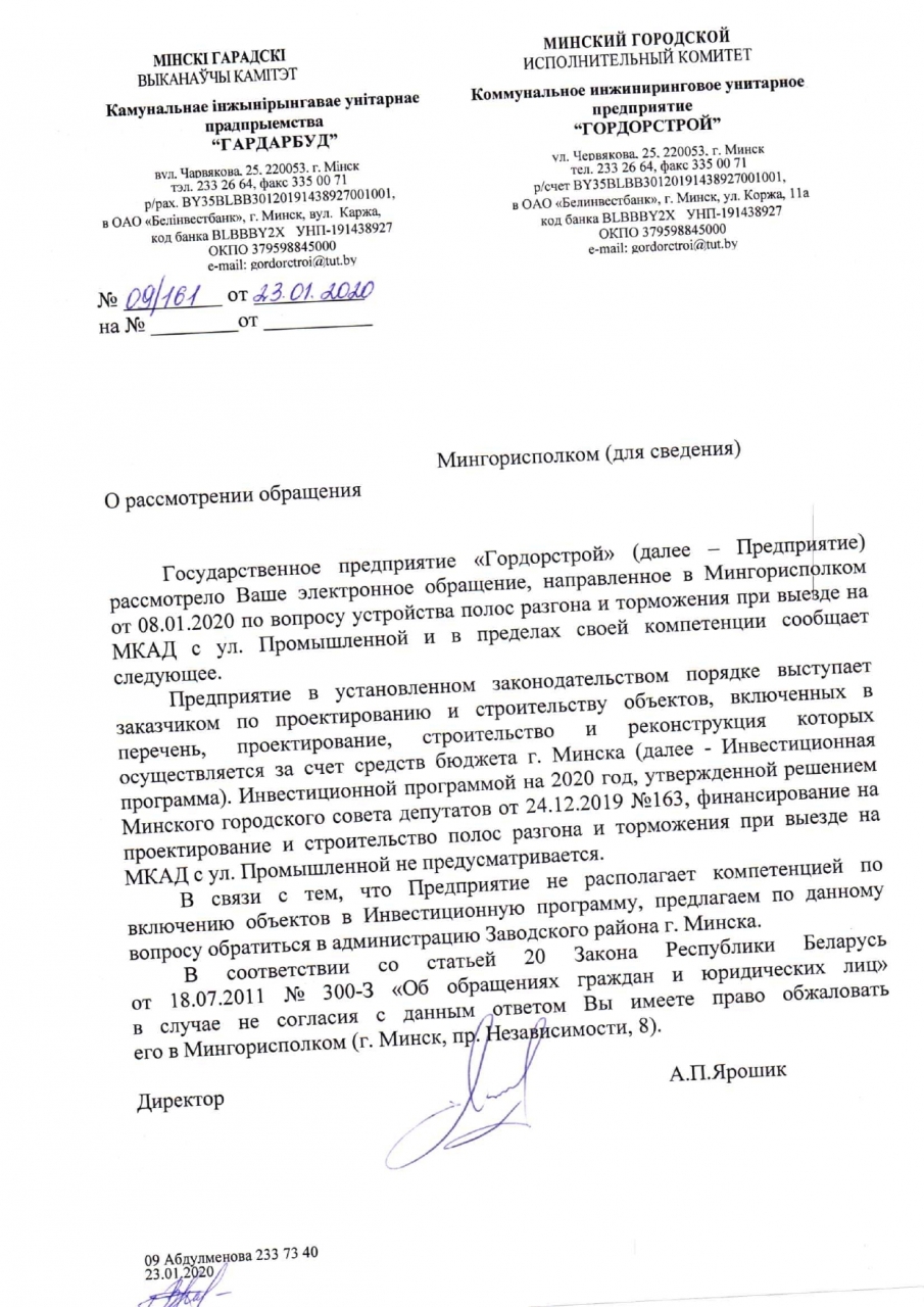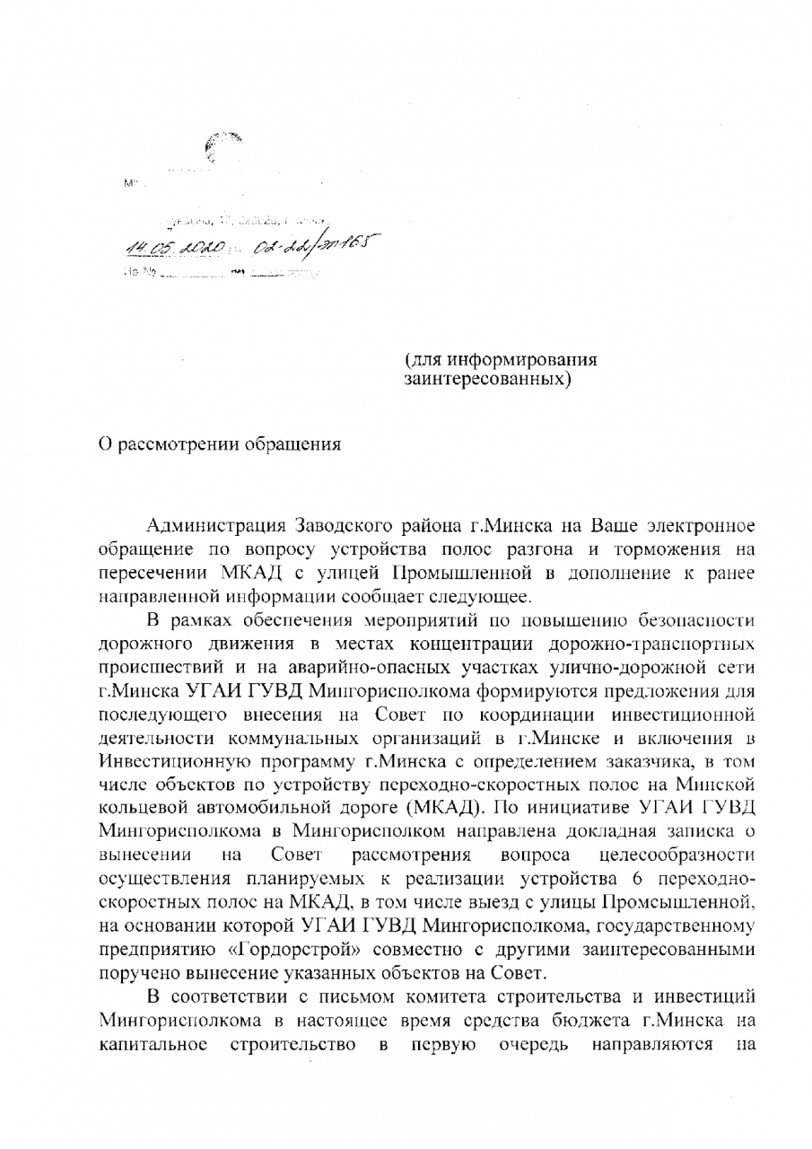 Вопрос финансирования проектирования переходно-скоростных полос МКАД - выезд с ул.Промышленной может быть рассмотрен комитетом строительства и инвестиций Мингорисполкома в ходе исполнения бюджета г.Минска по итогам 2020 г.