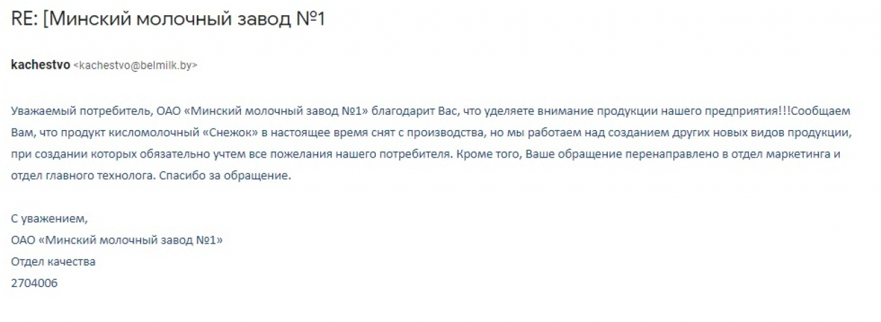 Продукт кисломолочный «Снежок» в настоящее время снят с производства, но Минский молочный завод №1 работает над созданием других новых видов продукции, при создании которых обязательно учтёт все пожелания потребителя.