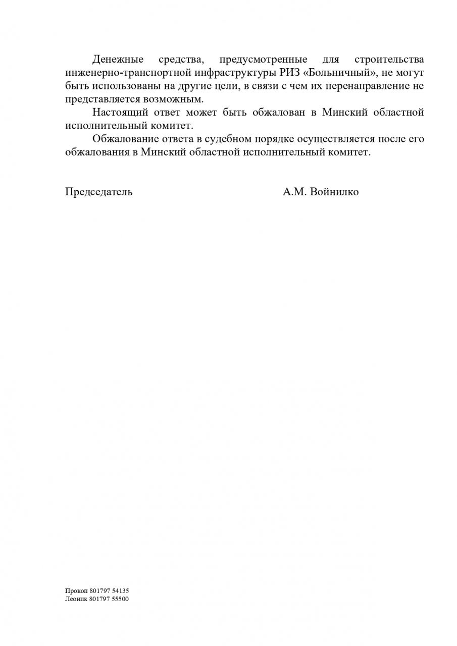 В обращениях указывалось на наличие большого количества свободных участков под застройку -751 в районе и 35 в г.Мядель, соответственно, имеются достаточные основания полагать, что проведение работ под РИЗ «Больничный» ведёт к обычной растрате бюджетных средств, на что Глава государства неоднократно указывал наказывать «жесточайше».