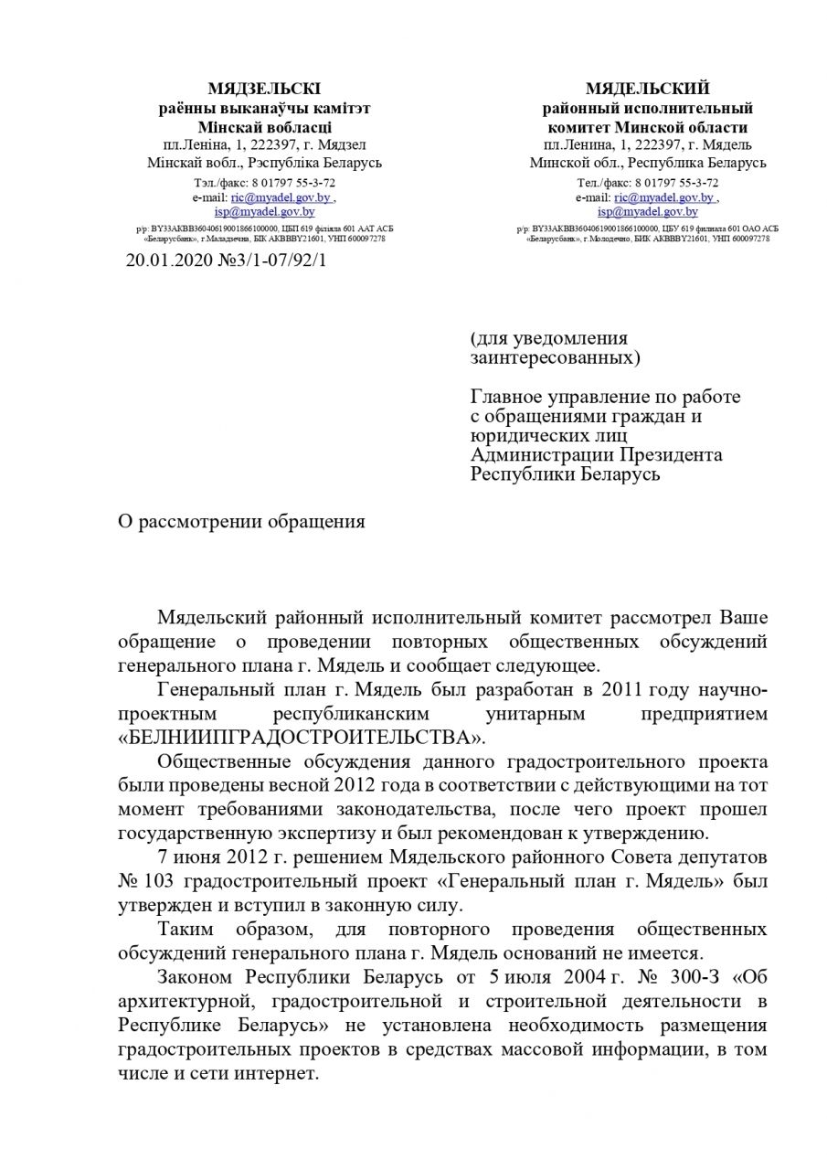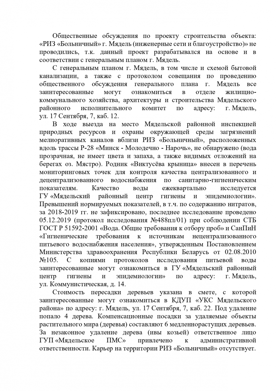 Согласно ответа УДП от 03.12.2019г. №22/5-27(13) по проблемам строительства по «район индивидуальной застройки» (РИЗ) «Больничный»» сообщаем о отсутствии предоставления экологической информации в соответствии со ст.№74 закона «О охране окружающей среды» и выражаем возмущение, т.к. ранее уже были направлены обращения и получены ответы от предложенных госструктур, в которых также отсутствует информация о проведении общественных обсуждений непосредственно перед проектом: РИК г.Мядель от 16.11.19г. №92/3/1-03Кл, Прокуратура Минской области от 02.10.19г. № 0702-17-2017, Облисполком от 28.10.19г. №11.2-6/13/4333-ТК/л.