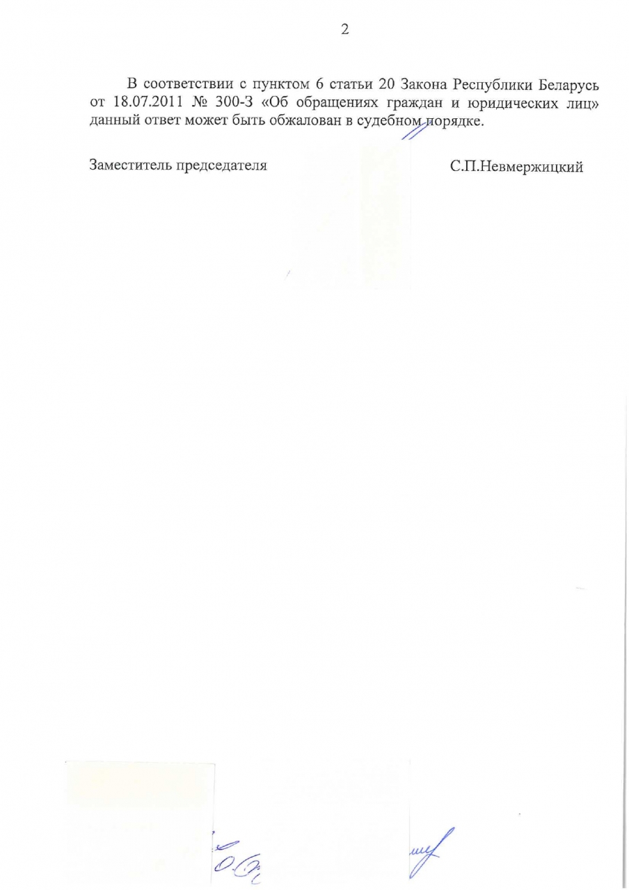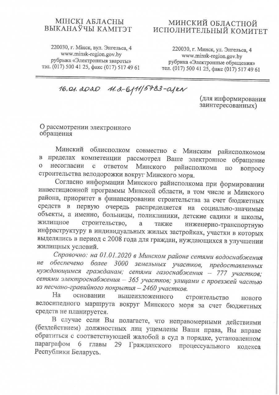 10 декабря 2019 мною получен ответ Минского райисполкома (копия прилагается) на электронное обращение по вопросу строительства велодорожки вокруг Минского моря. Указанный ответ я считаю не соответствующим требованиям законодательства в части полного, всестороннего и объективного рассмотрения обращений и направления мотивированных и обоснованных ответов гражданам по следующим причинам.