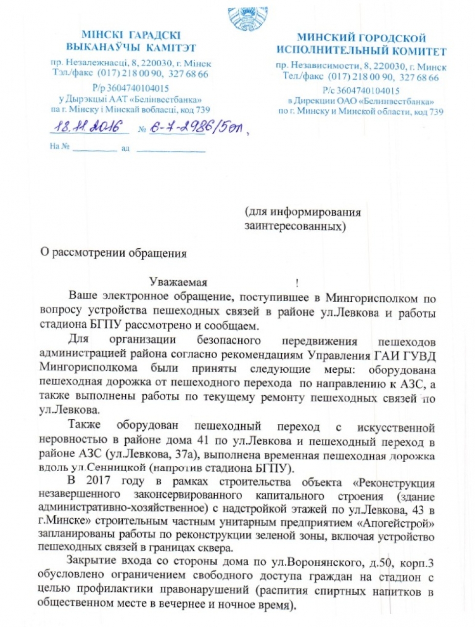 О принятых мерах просим сообщить письменно в адрес представителя инициативной группы – Мисюкевича Дмитрия Викторовича: 220007 г. Минск, ул. Сенницкая, 110. Тел для связи 8029-649-07-07.