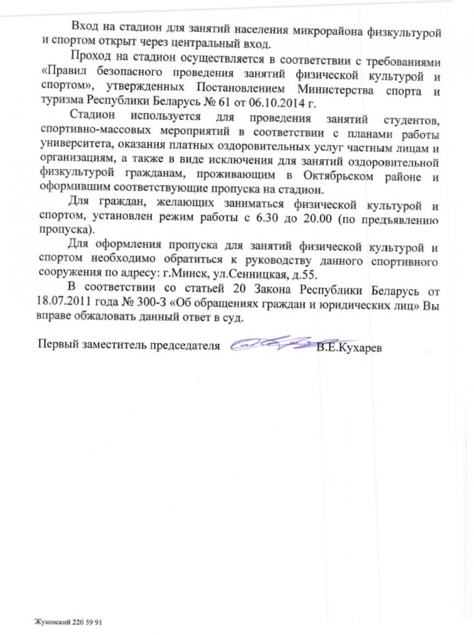 Также просим уделить внимание вопросу возможности посещения местными жителями стадиона для занятий спортом во время, когда не проходят занятия со студентами. На данный момент стадион после 18:00 регулярно закрыт.