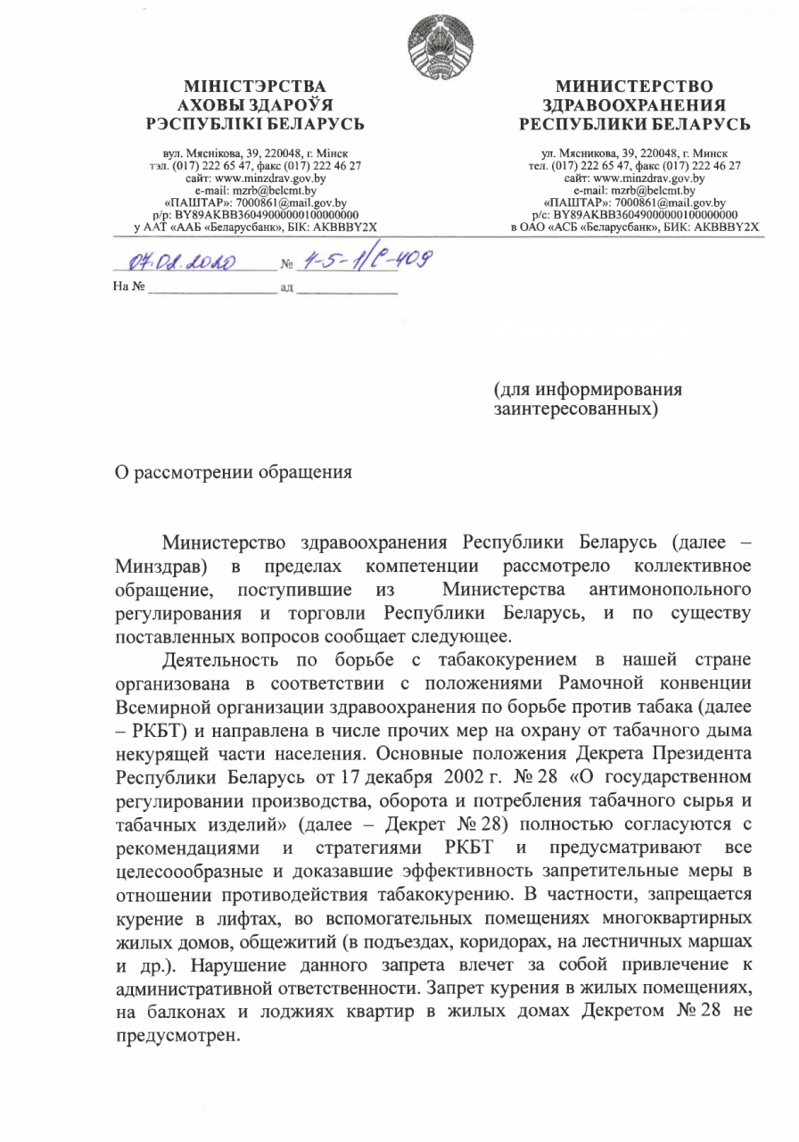 В ответе на электронное обращение с требованием запретить курить в многоквартирных домах, а также возле подъездов и придомовых территорий в 2019 году МАРТ в своем ответе сообщило следующее: