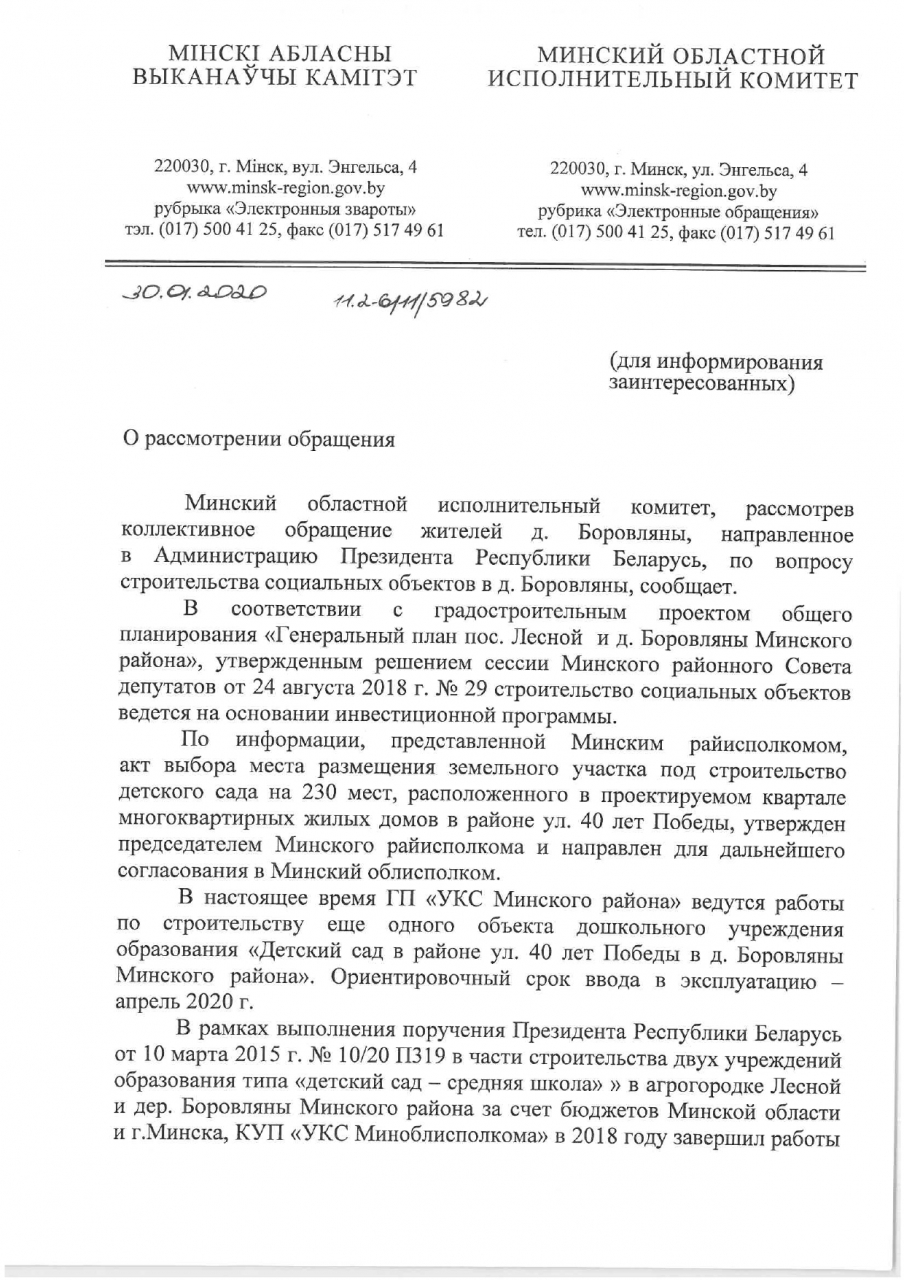 1. Объект строительства «Многоквартирные жилые дома в районе ул. 40 лет Победы в д. Боровляны Минского района» вести одновременно со строительством детских садов и школы в том же микрорайоне.