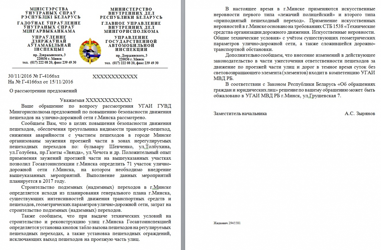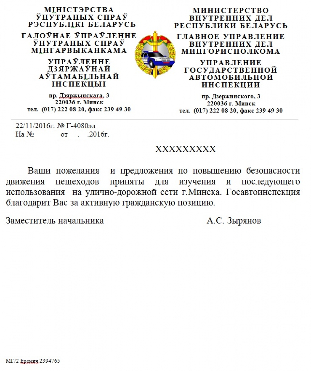 Пожелания и предложения по повышению безопасности движения пешеходов приняты городской ГАИ для изучения и последующего использования на улично-дорожной сети г.Минска.