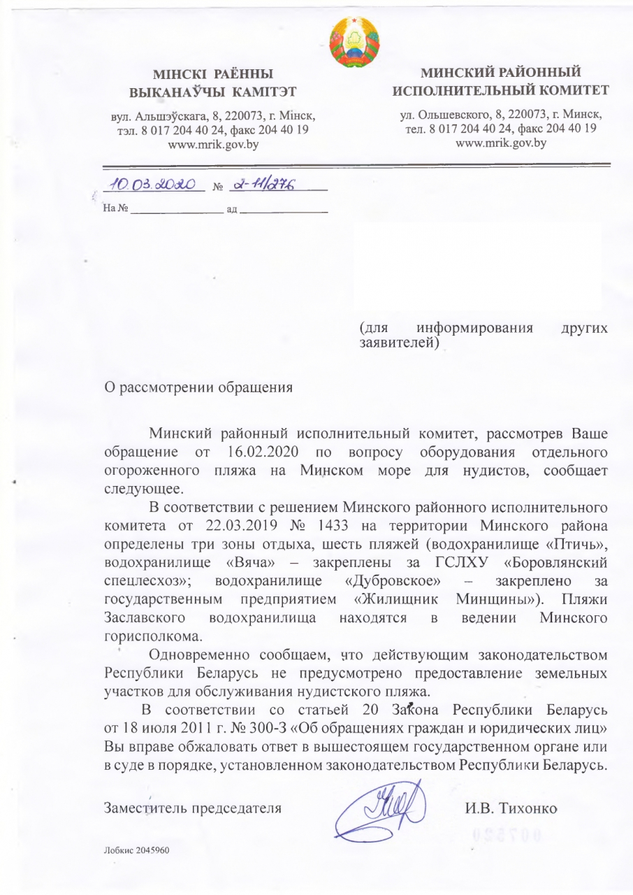 На основании ст. 41 Закона «О местном управлении и самоуправлении», которая устанавливает, что исполкомы распоряжаются природными ресурсами в случаях и порядке, предусмотренных законодательством об охране окружающей среды и рациональном использовании природных ресурсов, принимают меры по рациональному использованию природных ресурсов, предлагаем сделать отдельный огороженный пляж на Минском море, где нудисты смогут насладиться полноценным отдыхом, не мешать другим людям, которые не придерживаются данных взглядов и не быть привлечёнными к административной ответственности.