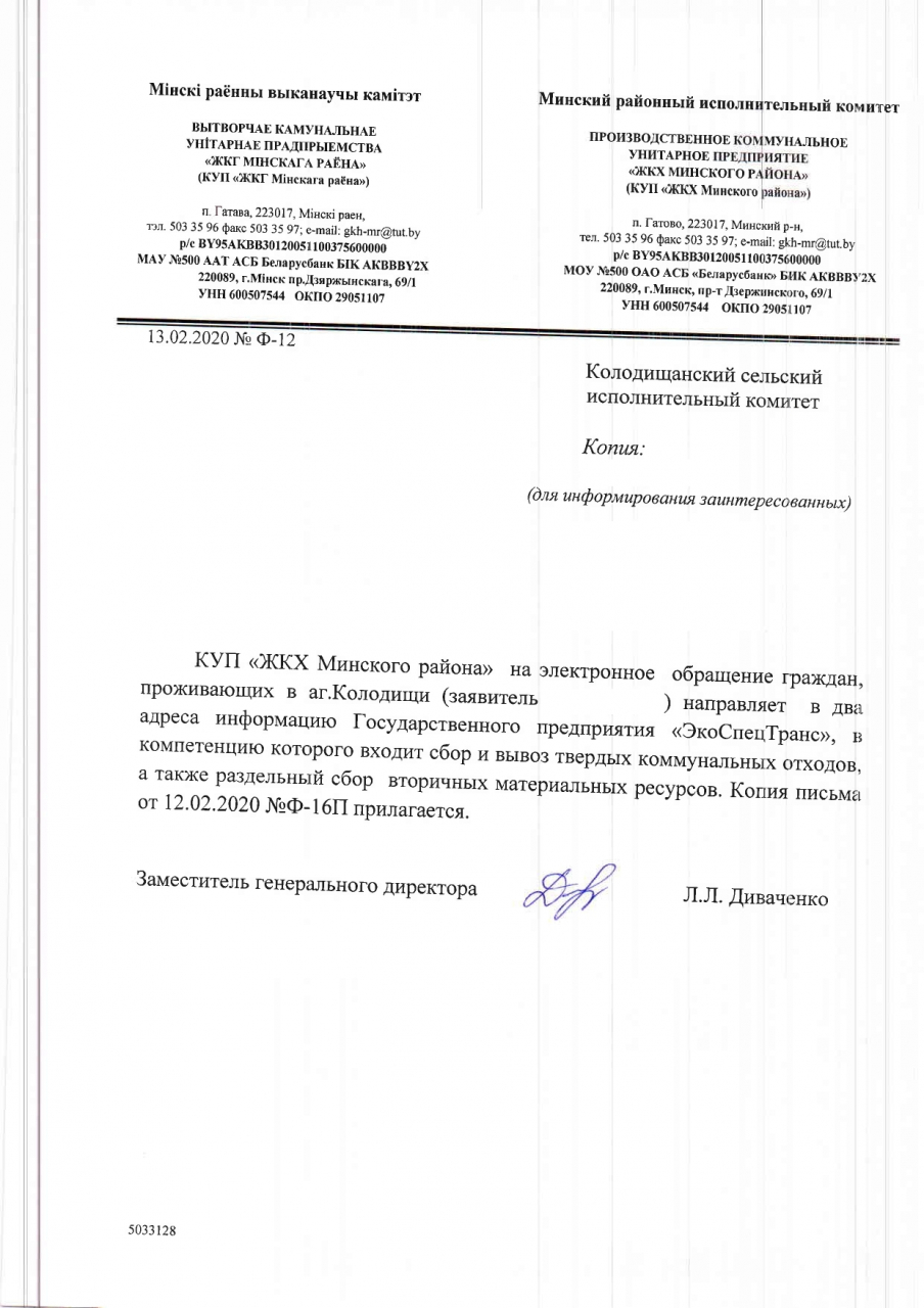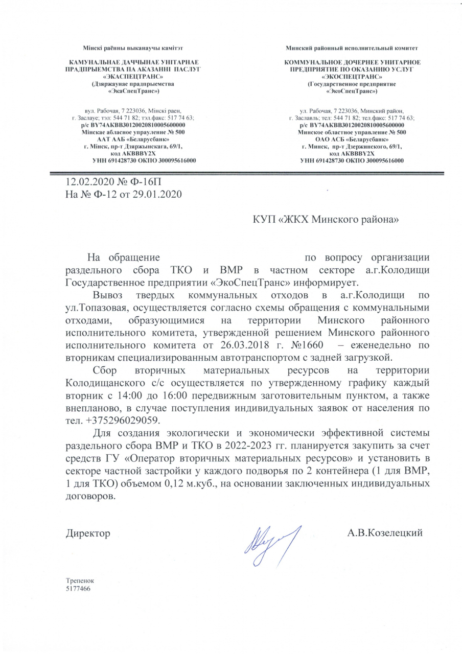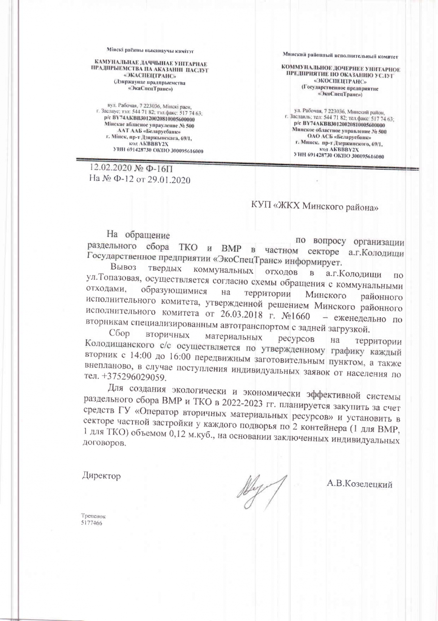 На основании вышеизложенного, руководствуясь ст. 44 Закона от 4 января 2010 г. № 108-З "О местном управлении и самоуправлении в Республике Беларусь", которая устанавливает, что исполкомы первичного уровня организуют работы по удалению коммунальных отходов, просим: