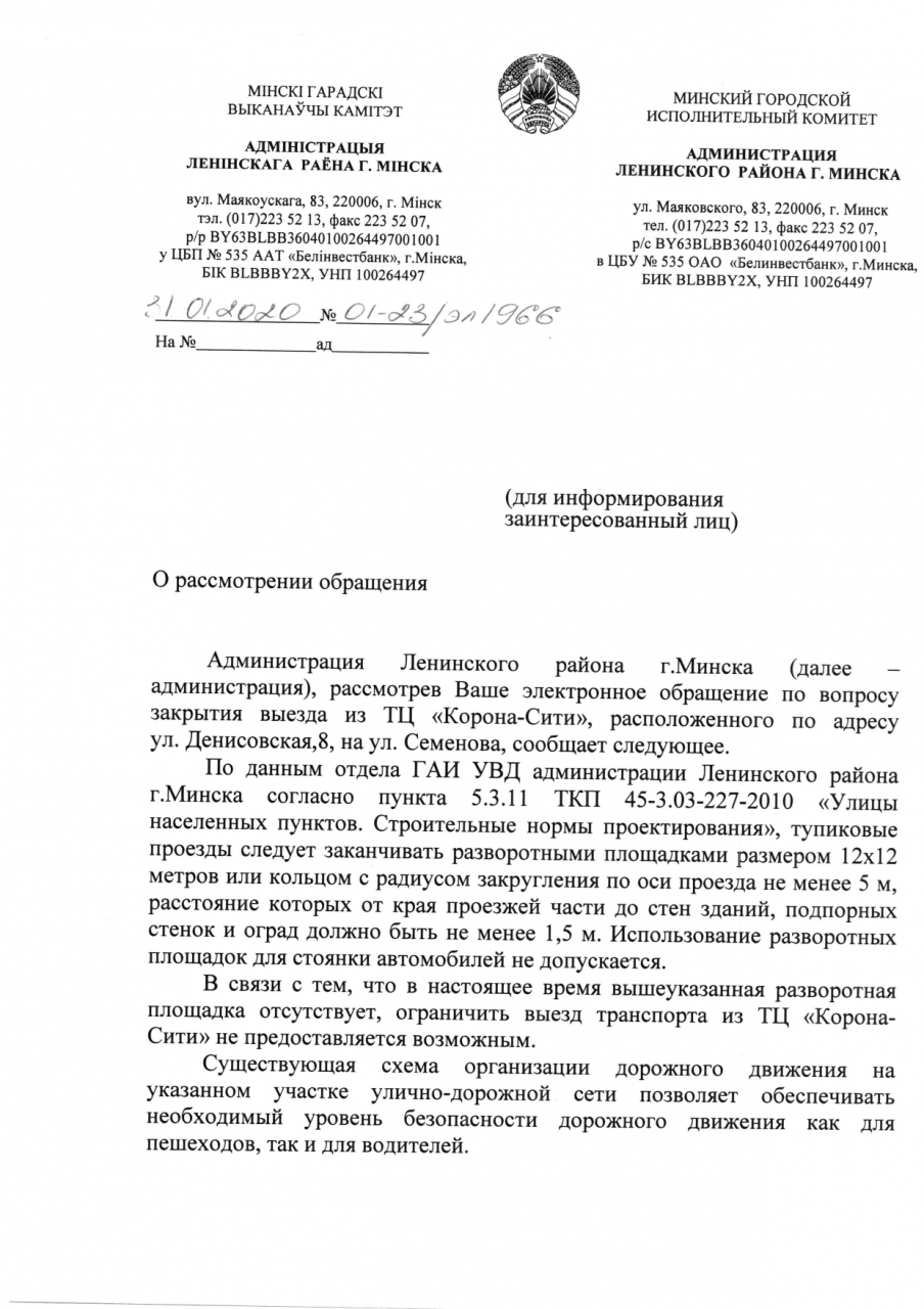 Уважаемая администрация Ленинского района города Минска, просим Вас закрыть бетонными плитами выезд из ТЦ "Корона-Сити", расположенного по адресу ул.Денисовская, 8, на улицу Семёнова в связи с тем, что: