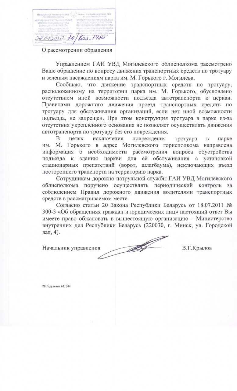 В адрес Могилёвского горисполкома направлена информация о необходимости рассмотрения вопроса обустройства подъезда к зданию церкви, расположенной в парке им.М.Горького, для её обслуживания с установкой стационарных препятствий, исключающих въезд постороннего транспорта на территорию парка. Сотрудникам ДПС ГАИ УВД Могилёвского облисполкома поручено осуществлять контроль за соблюдением ПДД водителями ТС в указанном месте.