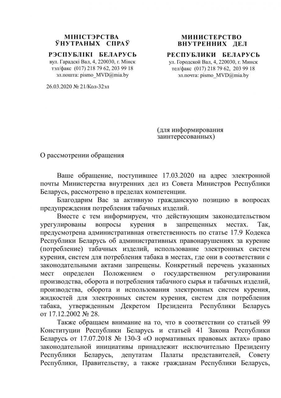 Мы, сознательные граждане, вкладывающие силы, время и деньги в своё здоровье, считаем, что в настоящее время в Республике Беларусь идёт ущемление некурящей части населения людьми с никотиновой зависимостью.