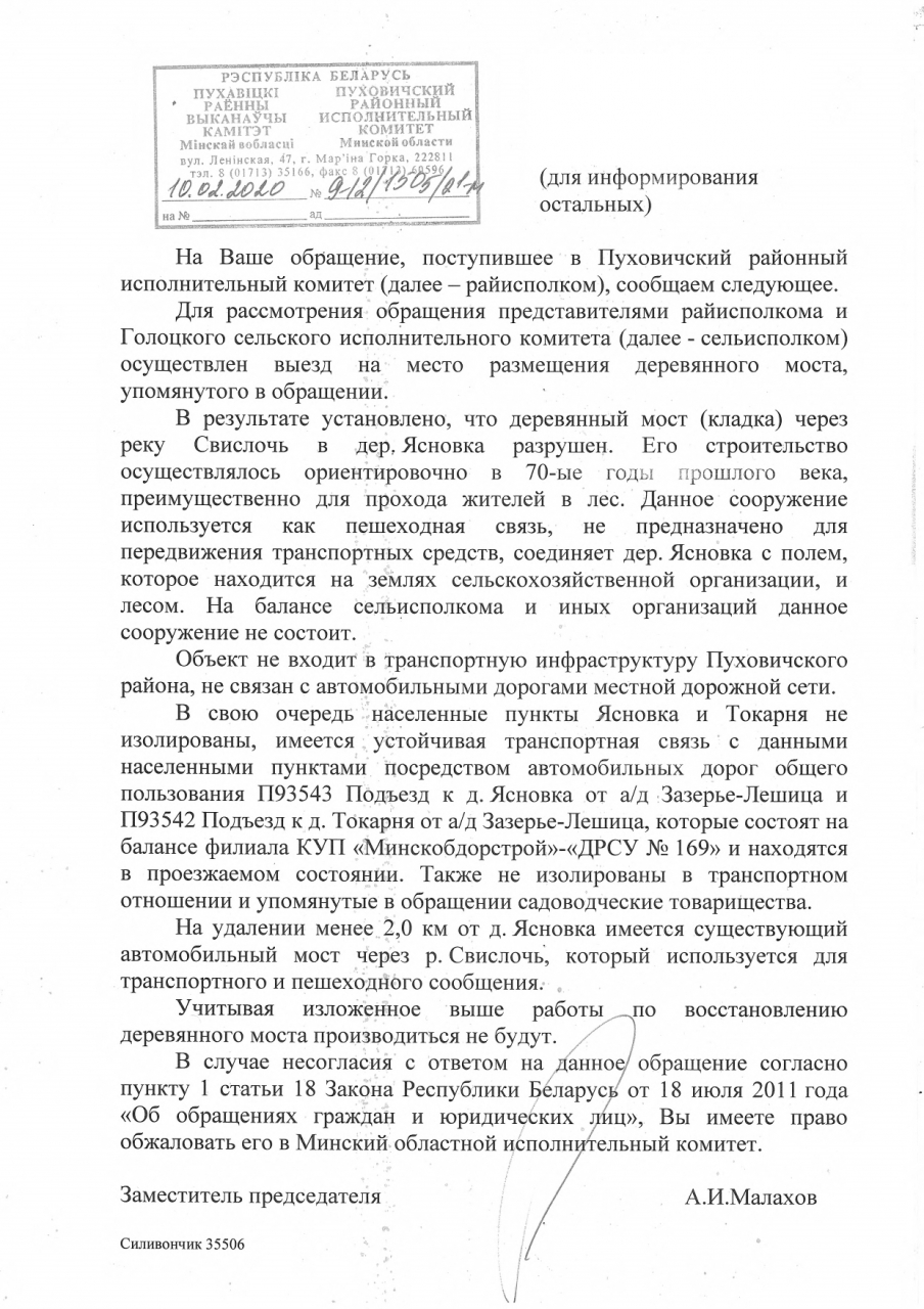 Мост возле деревни Ясновка в очень плачевном состоянии. В соседней деревне Токарня ситуация ещё хуже. Обращение на сайте райисполкома Пуховичского р-на Минской обл. на момент создания настоящего обращения было проигнорировано. Когда-то этот мост был построен вместо старого, располагавшегося неподалёку, когда тот пришёл в негодность. По нынешнему мосту, когда это позволяло его состояние, можно было проехать на легковом автомобиле. Позже, по мере его износа, можно было проехать только на двухколёсном транспортном средстве. А сейчас и пешком страшно идти. Прошу заметить, что мостом, несмотря на его опасное состояние, пользуются грибники, охотники и рыбаки, люди, которые хотят прогуляться по местам, расположенным на противоположном от Ясновки берегу реки Свислочь, дети, отдыхающие в близлежащих деревнях и садовых товариществах во время каникул, и некоторые владельцы дачных участков в с/т "Грозы" и с/т "Свислочь" для похода или поездки на велосипеде в магазин в деревню Зазерье. В этом году рядом с мостом сгрузили деревянные столбы, которые можно было бы использовать как дополнительный материал для постройки нового моста или реконструкции имеющегося.