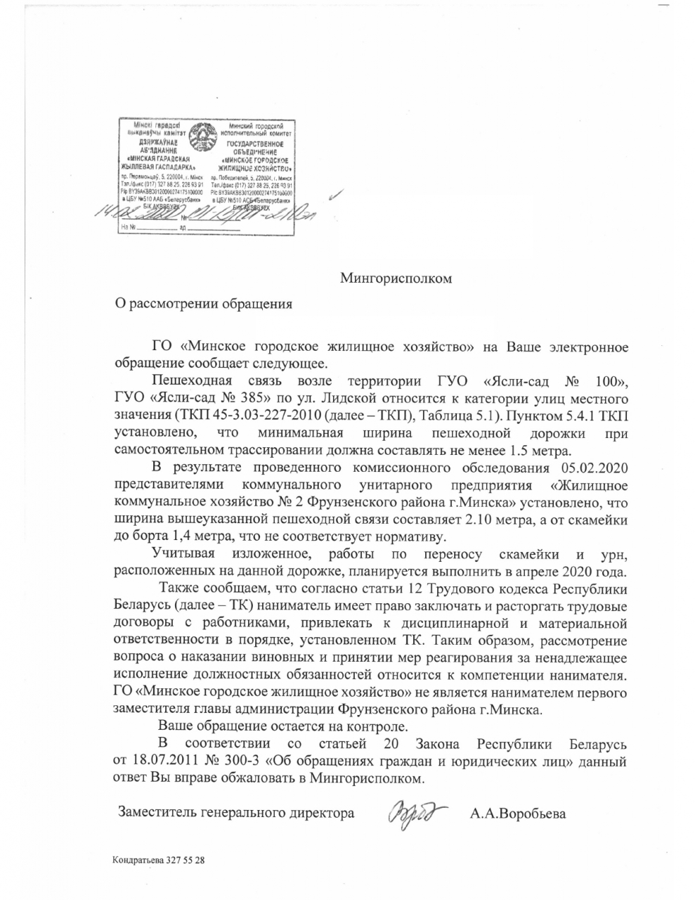 Работы по переносу урн и скамейки, расположенных на дорожке возле ГУО "Ясли-сад №100", планируется выполнить в апреле 2020 г.