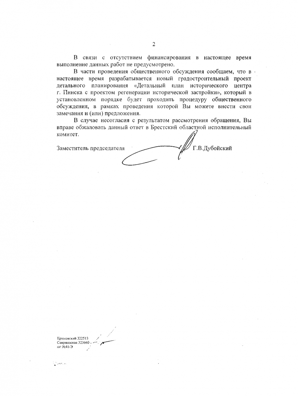 В связи с отсутствием финансирования в настоящее время выполнение работ не предусмотрено. Разрабатывается новый градостроительный проект детального планирования "Детальный план исторического центра г.Пинска с проектом регенерации исторического центра г.Пинска с проектом регенерации исторической застройки", в рамках проведения общественного обсуждения которого можно будет внести своим замечания и (или) предложения.