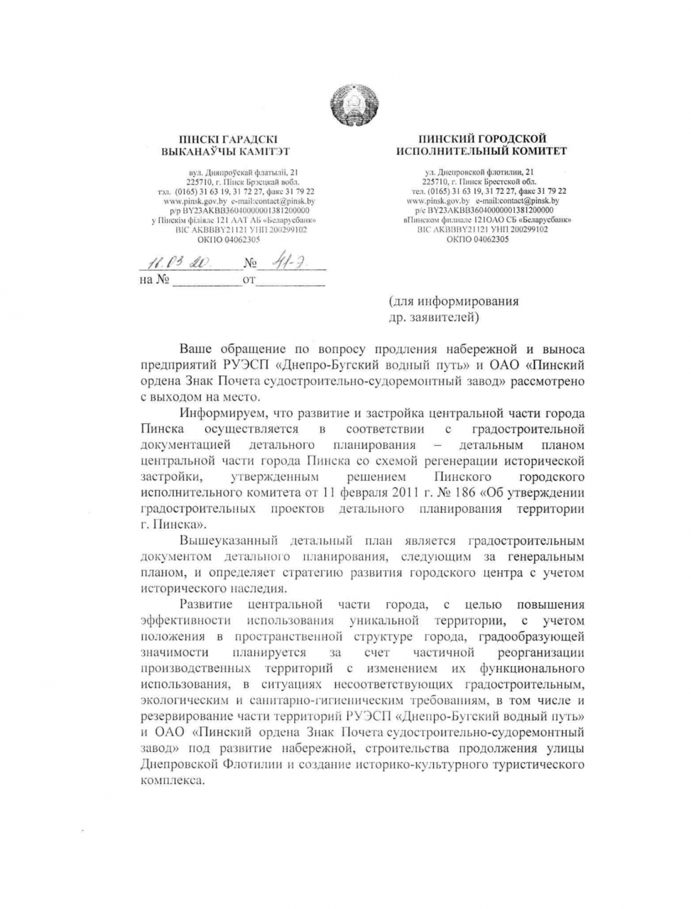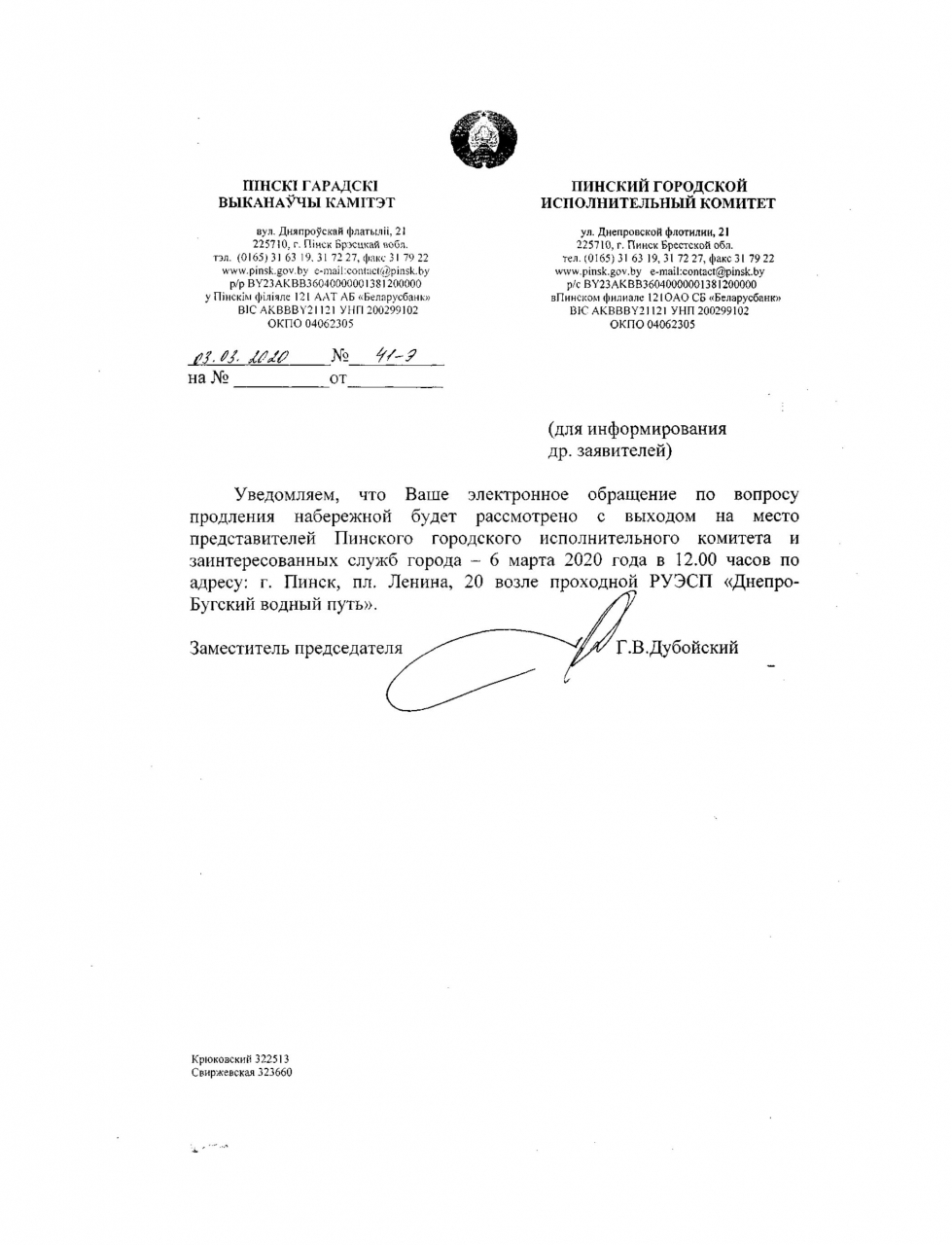 Обращение по вопросу продления набережной будет рассмотрено с выходом на место представителей Пинского горисполкома и заинтересованных служб 6 марта 2020 г. в 12:00 по адресу: г.Пинск, пл.Ленина, 20, возле проходной РУЭСП "Днепро-Бугский водный путь".