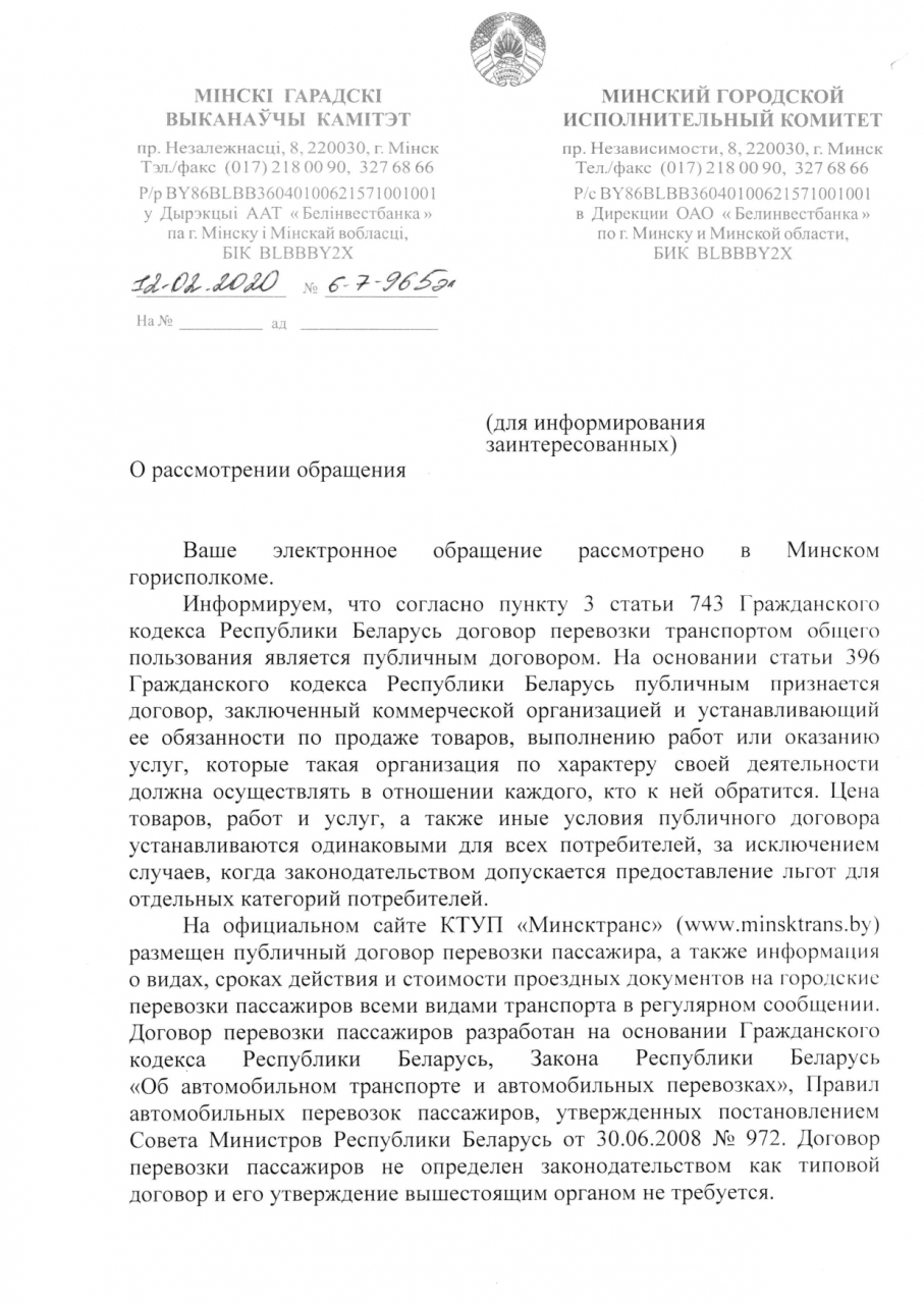 Договор составлен Минсктрансом в одностороннем порядке и не согласован, полагаем, ни с первым заявителем настоящего обращения, ни с каким другим пассажиром, который вынужден пользоваться услугами Минсктранса на таких странных, беспрецедентных условиях!