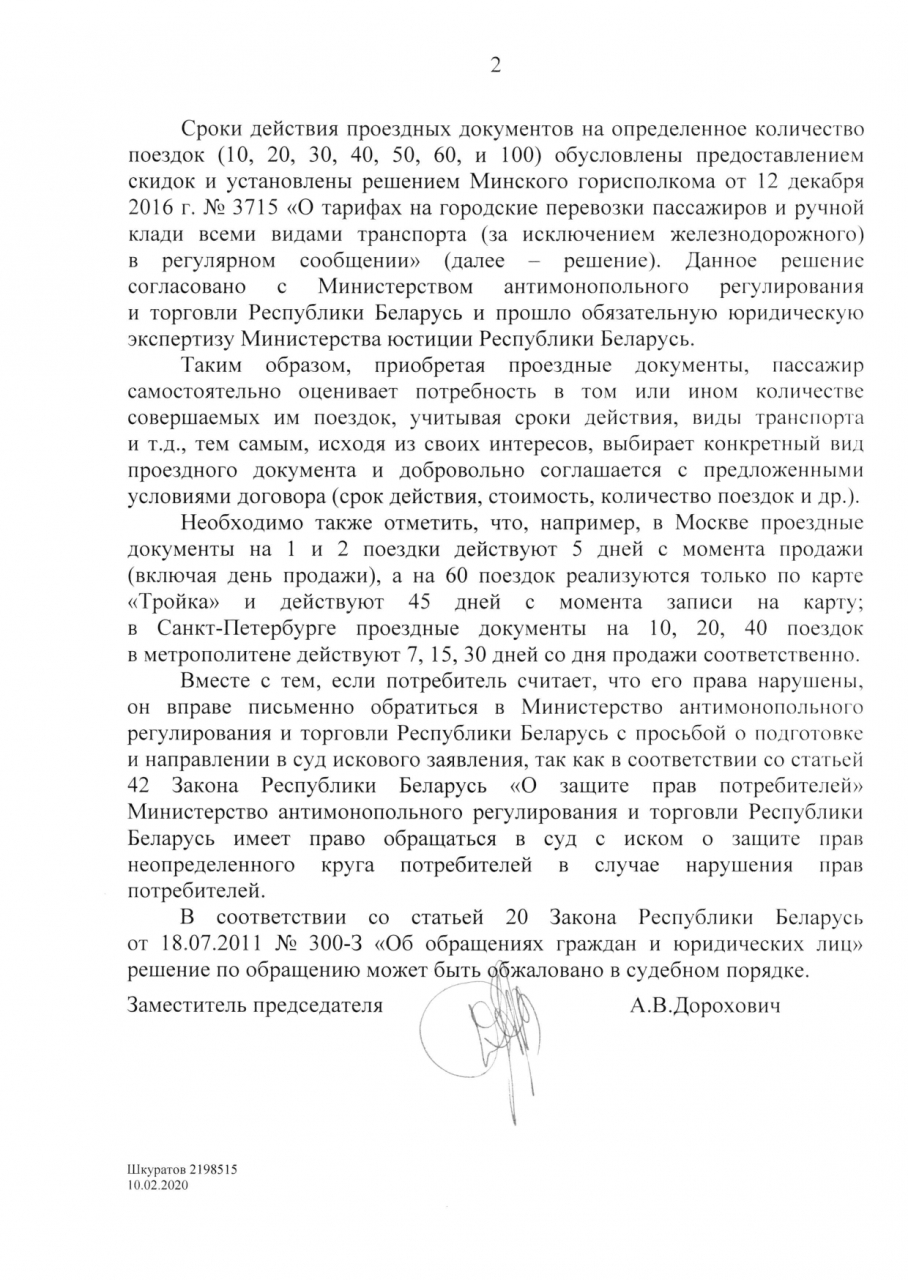 В данной ситуации, полагаем, имеет место нарушение Минсктрансом закона о защите прав потребителей, вызывает только резко отрицательную реакцию пассажира на неуважение его прав, как гражданина и потребителя услуг со стороны Минсктранса. Неоднократно первый в списке заявитель настоящего обращения слышала в транспорте со стороны пассажиров недовольство по этому поводу: «Проще ездить без билета, чем покупать проездные! Дешевле выходит!». А на ум первому в списке заявителю настоящего обращения приходят слова, высказанные классиком: «Страшно далеки они от народа!», когда в ответ на её предложение снять временные ограничения на использование оплаченных поездок при покупке пассажиром при покупке или пополнении проездного количество поездок, первому заявителю приходит, по нашему мнению, ответ не по существу, из Минсктранса на 2 листах, что покупая поездки в городском транспорте на 2 месяца, пассажир тем самым подписывает договор и несёт за него ответственность, и нарушать его не имеет права!
