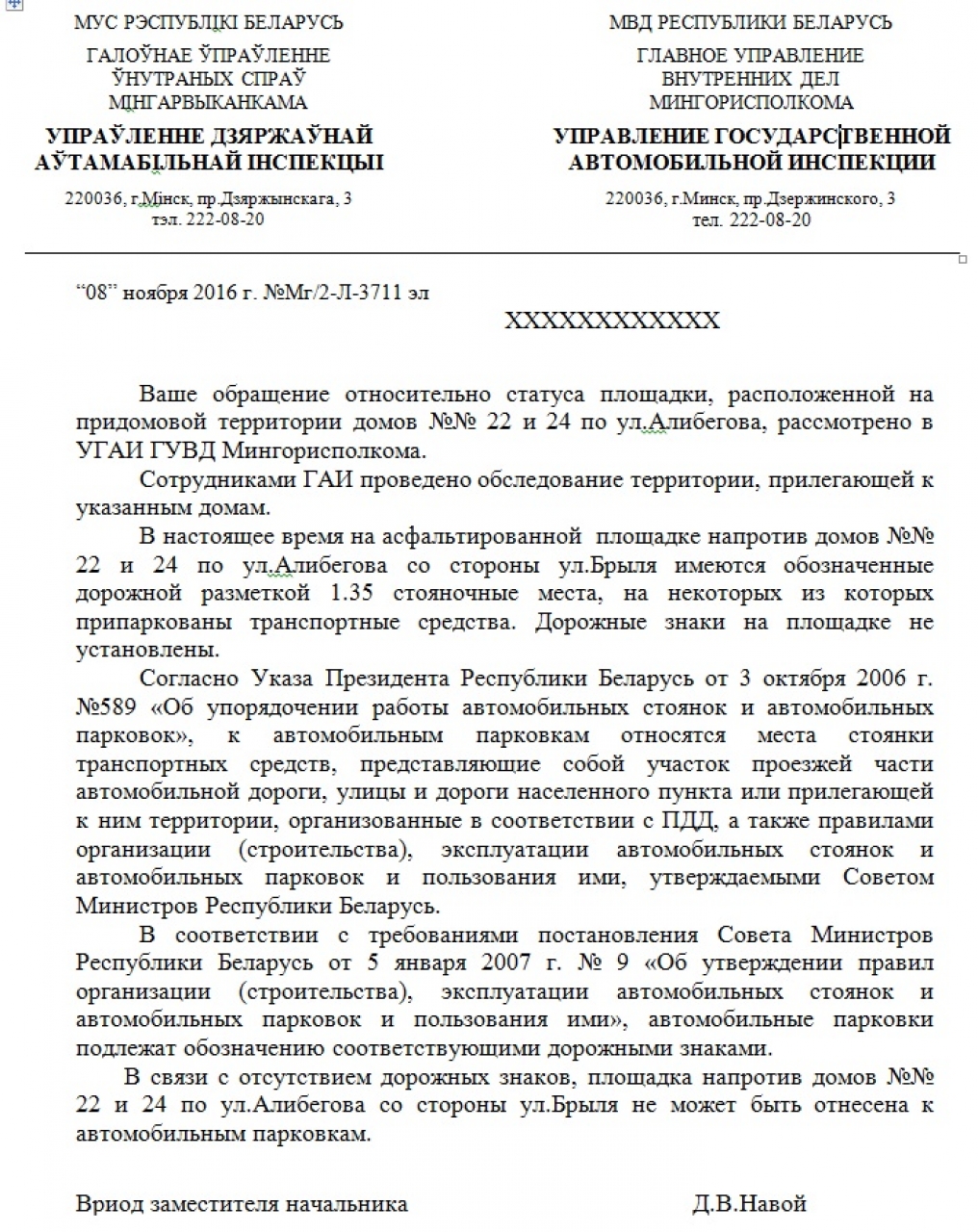 2. Просим провести проверку законности установки шлагбаума, ограничивающего проезд к местам общей парковки автомобилей в районе домов 22 и 24 по ул.Алибегова в г. Минске.