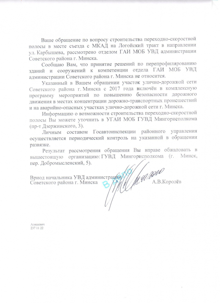 Указанный участок улично-дорожной сети Советского района г.Минска с 2017 г. включён в комплексную программу мероприятий по повышению безопасности дорожного движения в местах концентрации ДТП и на аварийно-опасных участках улично-дорожной сети г.Минска.