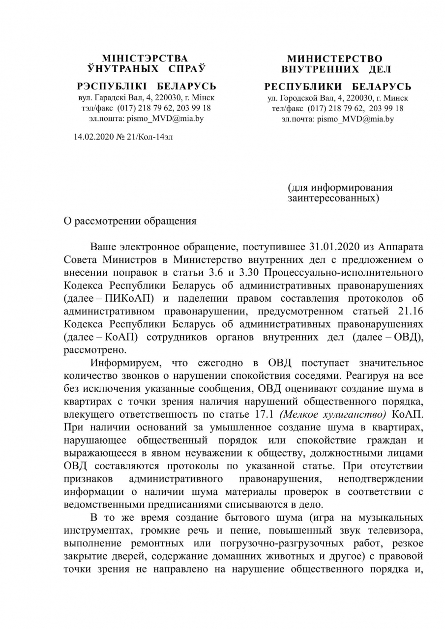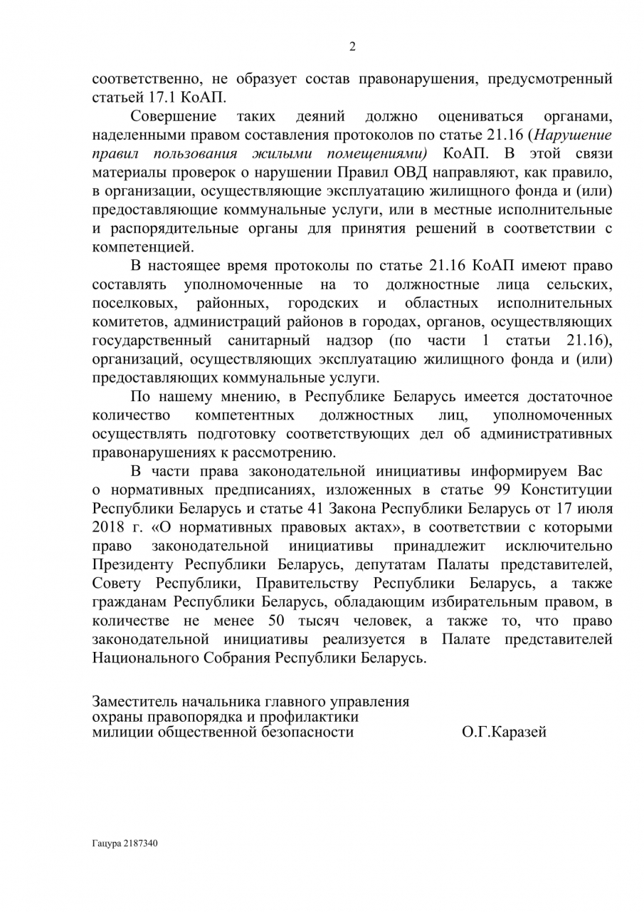 1. Передать право на составление протоколов по п. 21.16 правил пользования жилыми помещениями органам Министерства внутренних дел, выполнив соответствующие правки в ст. 3.6 и 3.30 ПИКоАП (как это сделано во все странах мира кроме Республики Беларусь).