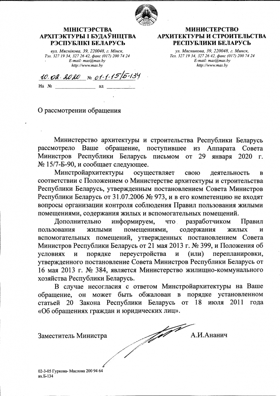 В компетенцию Минархитектуры не входят вопросы организации контроля соблюдения Правил использования жилыми помещениями, содержания жилых и вспомогательных помещений. Разработчиком указанных Правил является Минжилкомхоз.