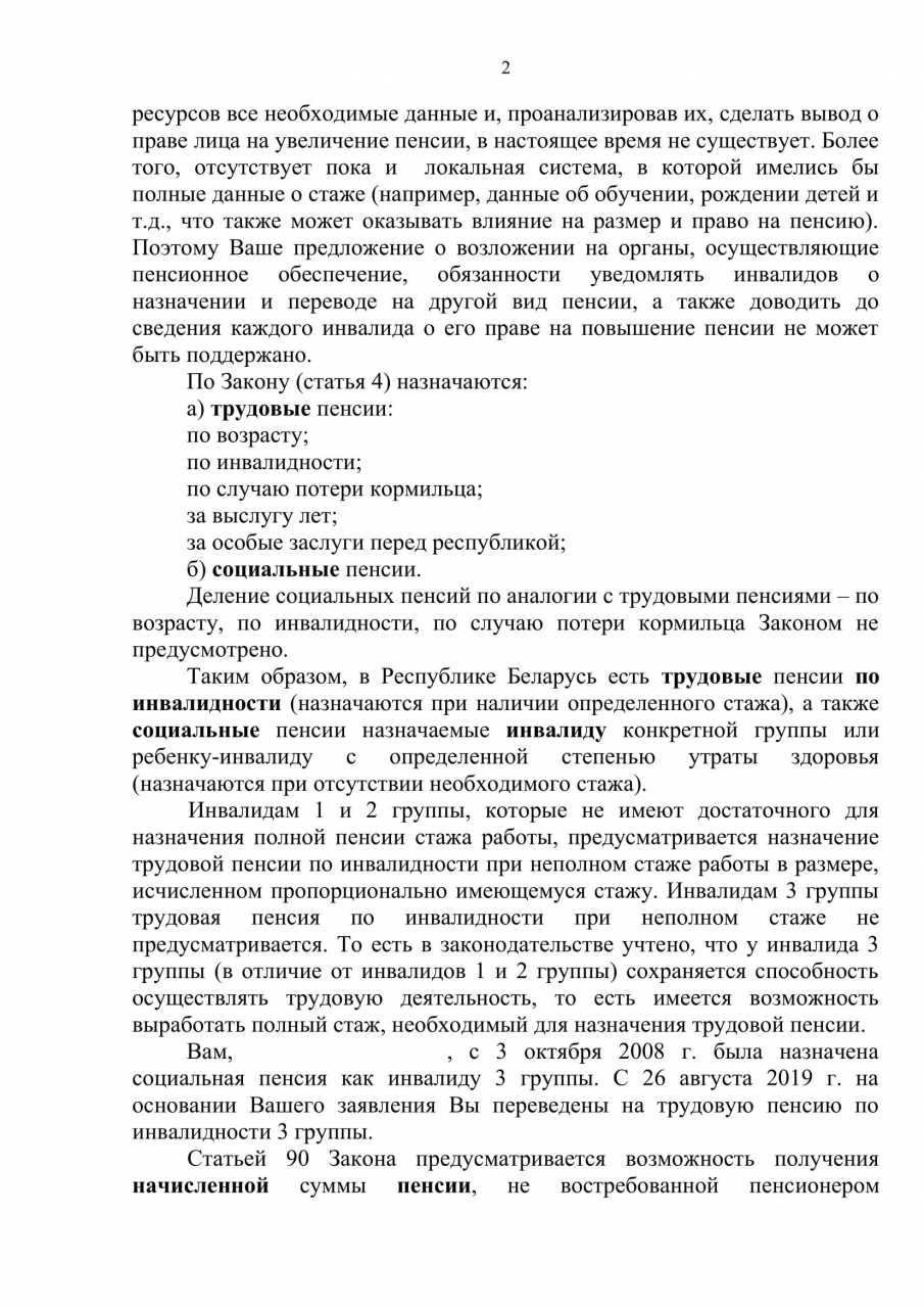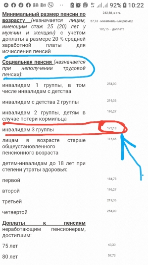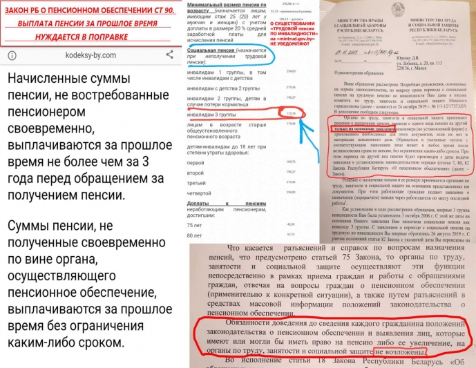 добавить конкретику о "социальной пенсии", так как описание "назначается при неполучении трудовой пенсии" без упоминания "инвалидности" (которое написано на сайте "Министерство труда и социальной защиты Республики Беларусь") может многих людей вводить в заблуждение, как и первого в списке заявителя настоящего обращения, много лет не знавшего, что он 11 лет получал "социальную пенсию" как безработный инвалид из-за собственного незнания о существовании "трудовой пенсии по инвалидности", которая заметно выше не трудовой пенсии.