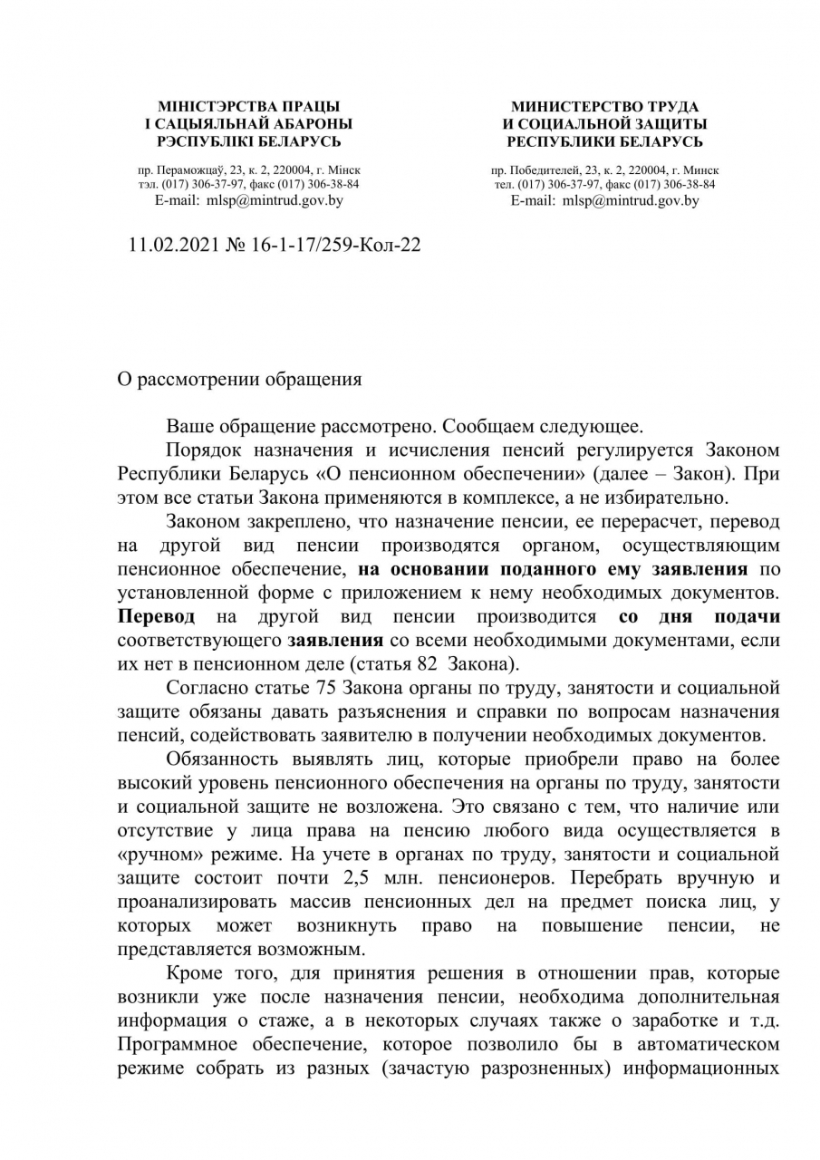 Мы, нижеподписавшиеся, просим внести в Указ Президента Республики Беларусь поправку в следующих статьях Закона Республики Беларусь "О пенсионном обеспечении" (далее - Закон):