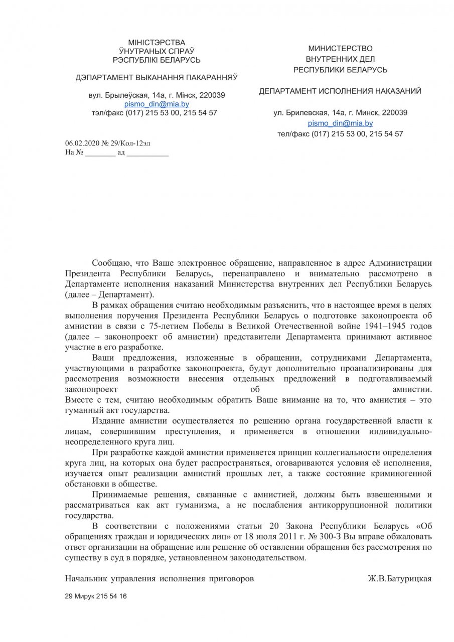 Обращаемся с просьбой к Главе государства, Александру Григорьевичу Лукашенко, включить в разрабатываемый Закон об амнистии 2020 года положение о снижении наказания на один год к лицам, осужденным за совершение коррупционных преступлений.