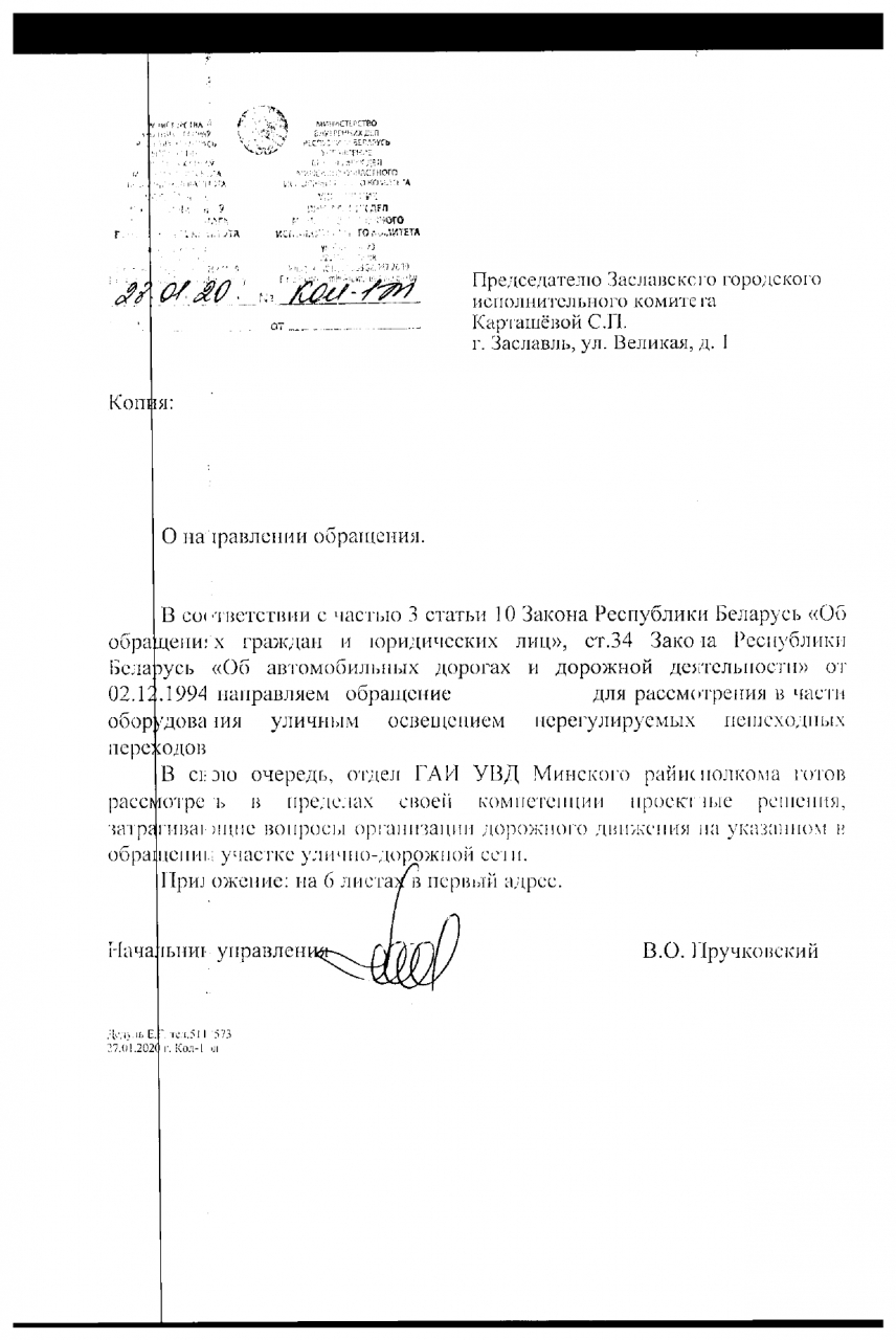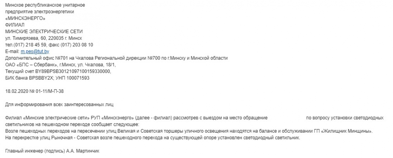 Исполком направил запрос ГП "Жилищник Минщины" во вопросу установки светодиодных фонарей и предложил Минрайгоравтодору установить светоотражающие элементы на указанных пешеходных переходах.