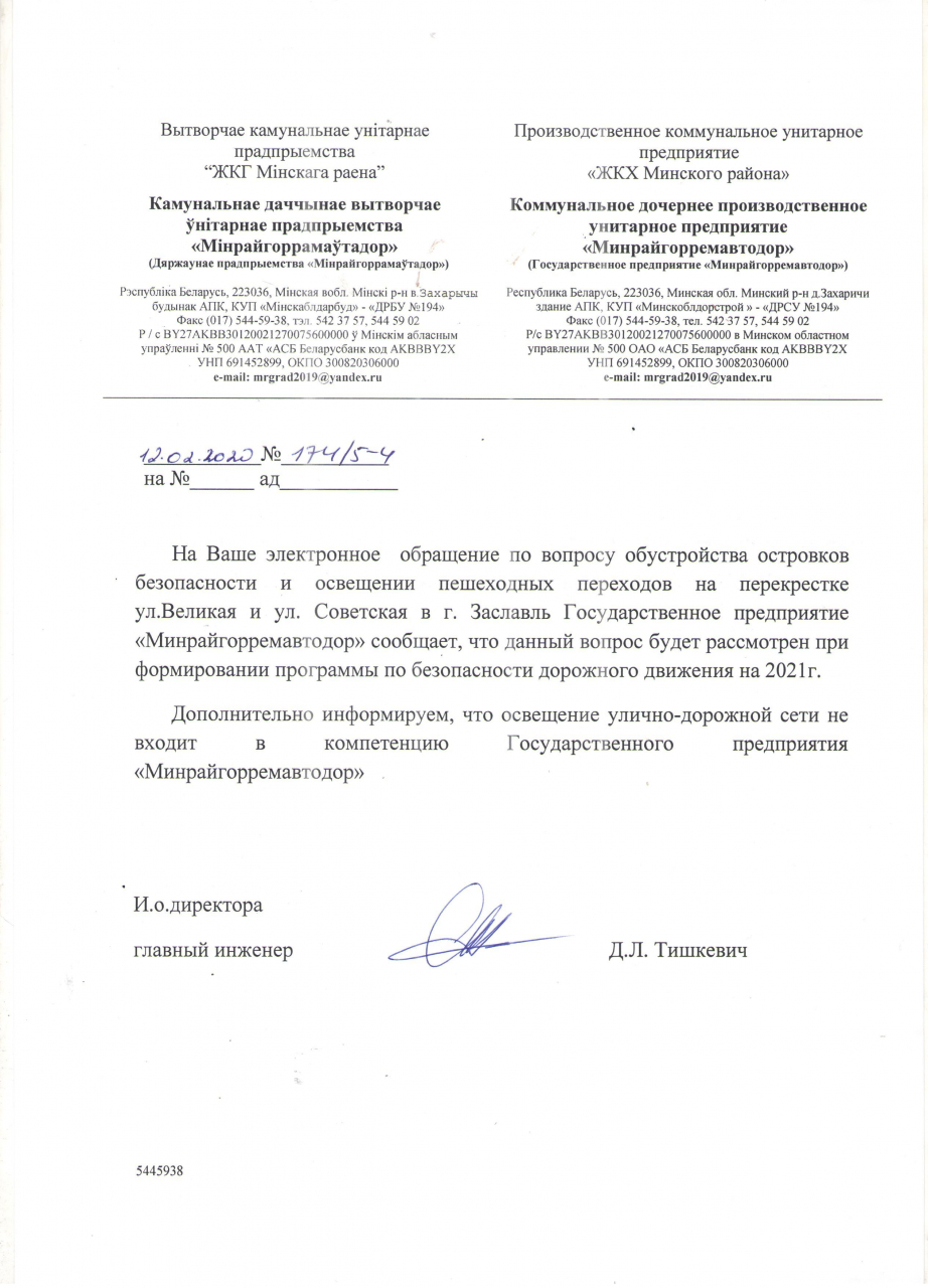 Вопрос по обустройству островков безопасности и освещения пешеходных переходов на перекрёстке ул.Великая и ул.Советская ГР "Минрайгорремавтодор" будет рассмотрен при формировании программы по безопасности дорожного движения на 2021 г.