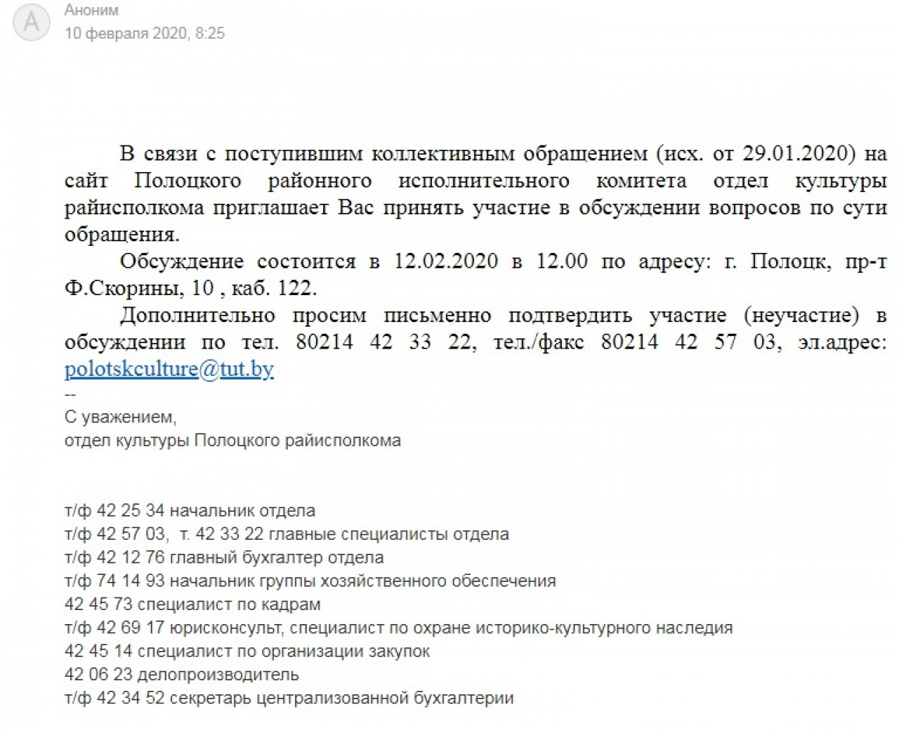 Отдел культуры Полоцкого райисполкома приглашает заявителей принять участие в обсуждении вопросов по сути обращения. Обсуждение состоится 12.02.2020 в 12.00 по адресу: г.Полоцк, пр-т Ф.Скорины, 10 , каб. 122. Просят письменно подтвердить участие (неучастие) в обсуждении по тел. 80214 42 33 22, тел./факс 80214 42 57 03, эл.адрес: [email protected].