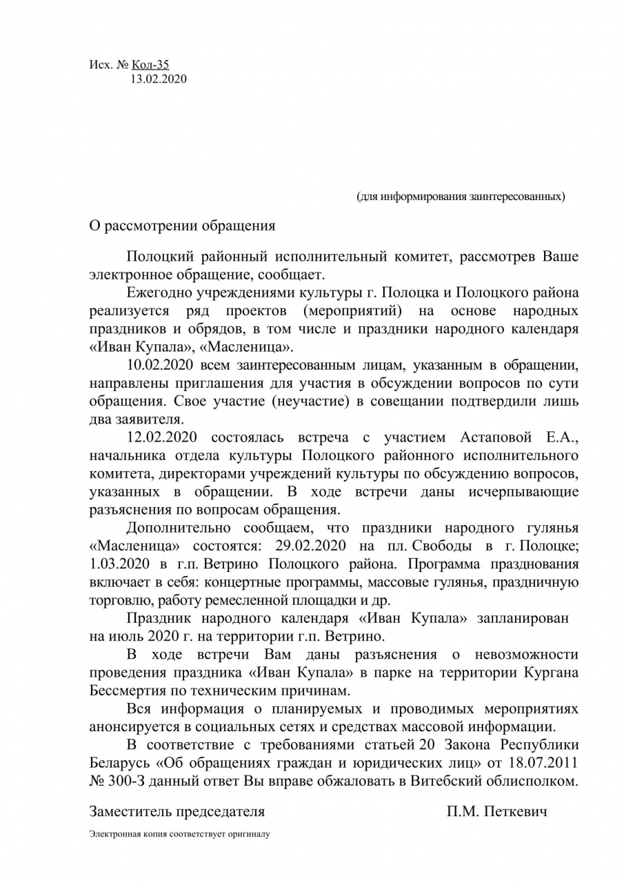 В ходе встречи заинтересованных лиц с начальником отдела культуры Полоцкого райисполкома даны исчерпывающие разъяснения по вопросам обращения. Праздники народного гулянья «Масленица» состоятся 29.02.2020 на пл. Свободы в г. Полоцке; 1.03.2020 в г.п. Ветрино Полоцкого района. Праздник народного календаря «Иван Купала» запланирован на июль 2020г. на территории г.п. Ветрино. В ходе встречи даны разъяснения о невозможности проведения праздника «Иван Купала» в парке на территории Кургана Бессмертия по техническим причинам.