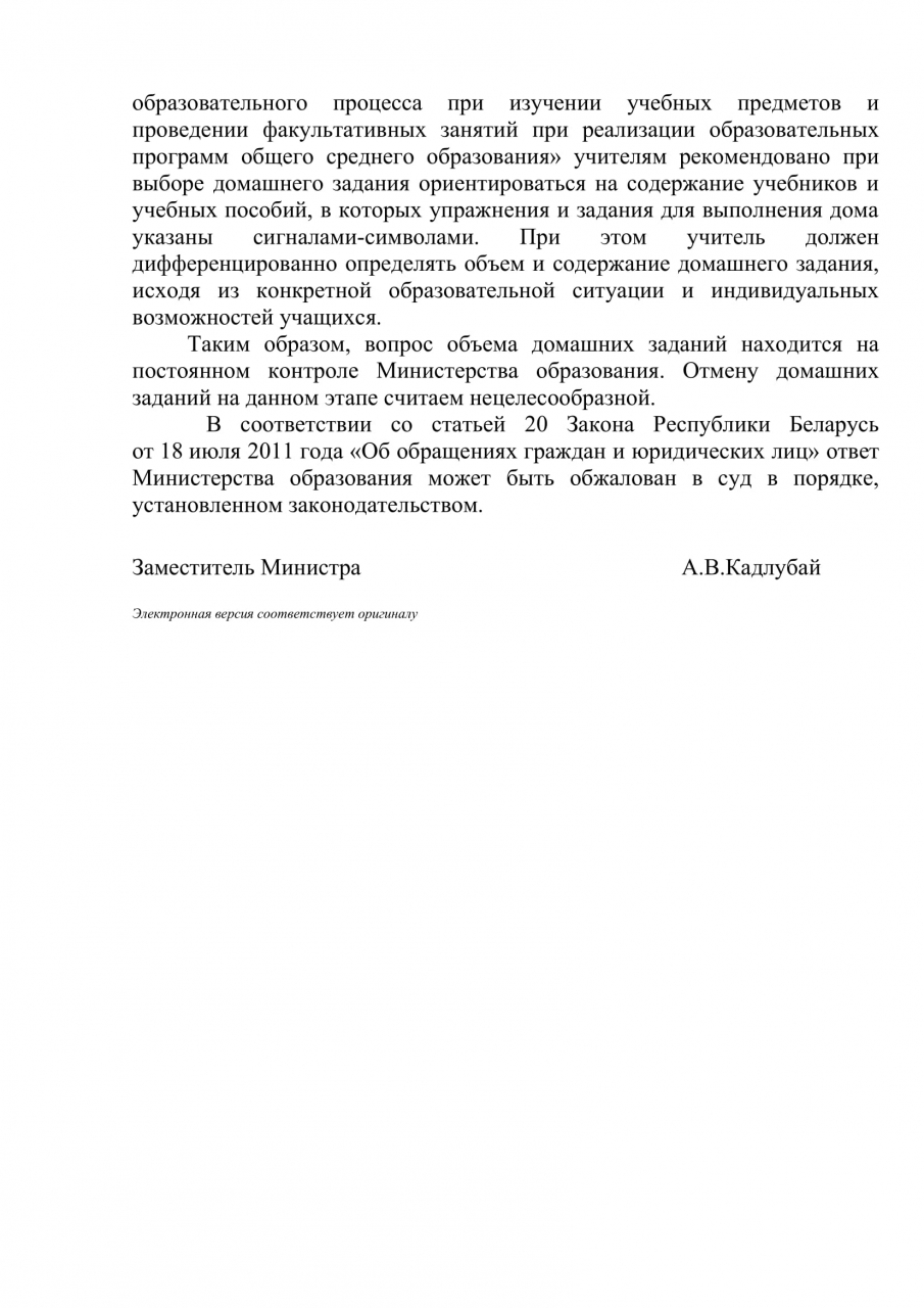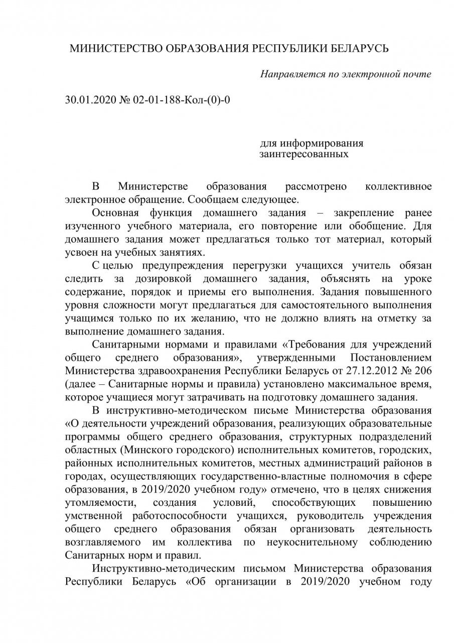 В связи с изложенным и на основании Положения о Министерстве образования Республики Беларусь, утвержденного Постановлением Совета Министров Республики Беларусь от 04.08.2011 N 1049, которое к основным задачам Минобразования относит обеспечение реализации государственной политики в сфере образования, просим принять меры по оптимизации учебной нагрузки на школьников в виде сокращения объемов домашнего задания вплоть до полной его отмены.