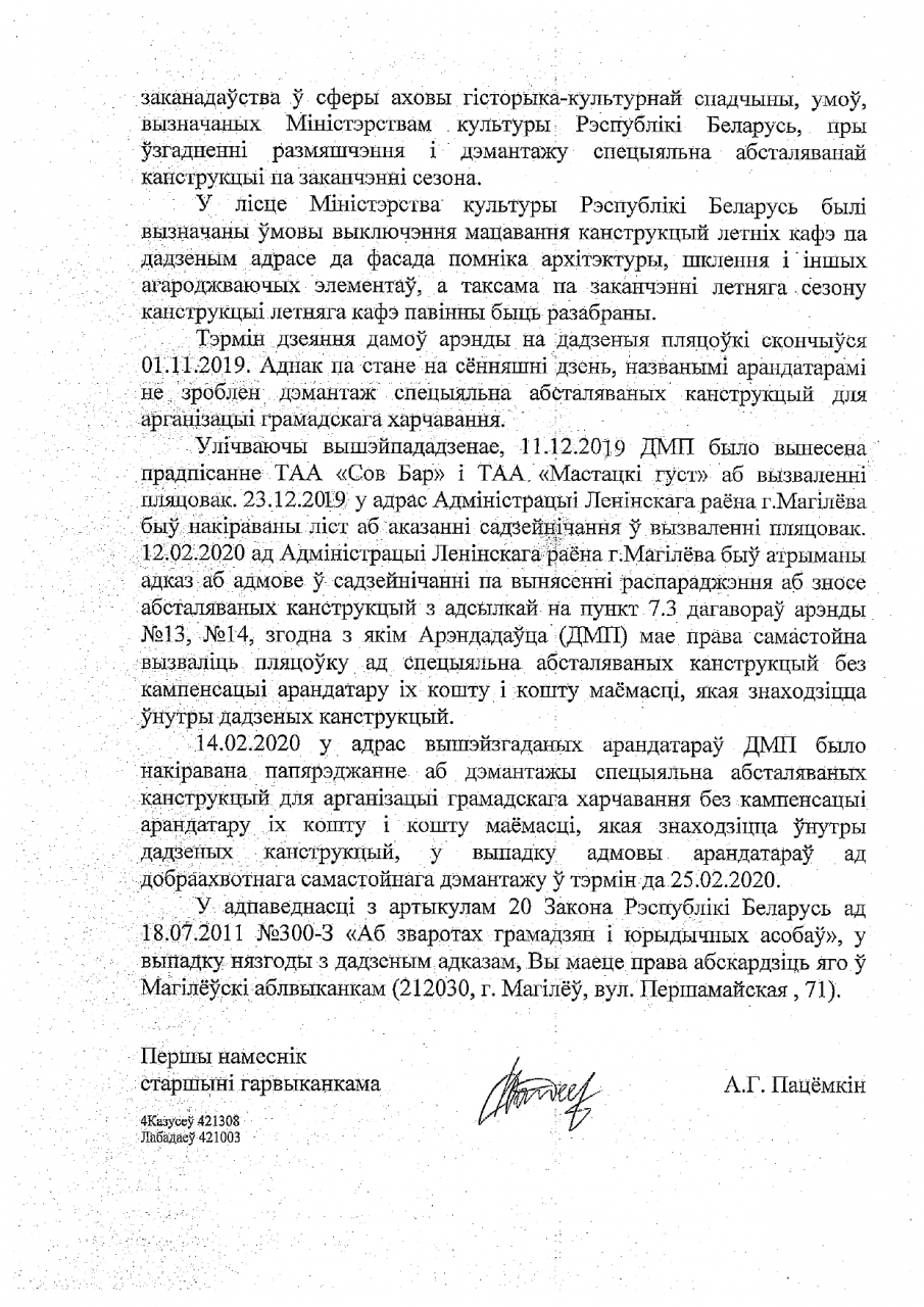 У адрас арандатараў Магілёўскім ДМП накіравана папярэджанне аб дэмантажы спецыяльна абсталяваных канструкцый для арганізацыі грамадскага харчавання без кампенсацыі арандатару іх кошту і кошту маёмасці, у выпадку адмовы арандатараў ад добраахвотнага самастойнага дэмантажу ў тэрмін да 25.02.2020.