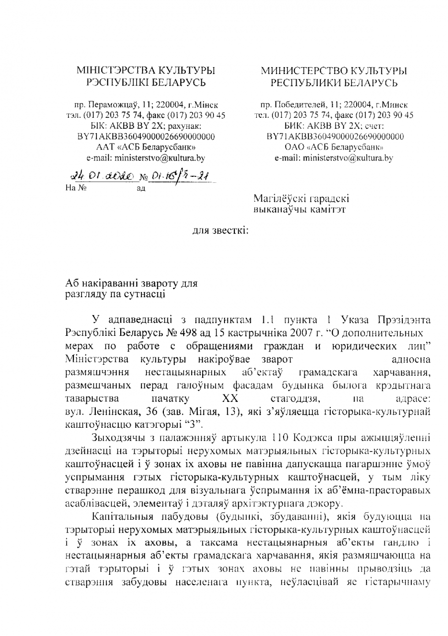 Прашу давесці да Магілёўскага гарвыканкама неабходнасць неадкладнага дэмантажу гэтых тэрас і рэкамендаваць выкарыстоўваць у зоне аховы гістарычнага цэнтра лёгкія тэрасы без глухіх шкляных сцен і капітальнага даху, з выкарыстаннем тэнтавых ценявых навесаў ці парасонаў, якія лёгка прыбіраюцца ў халодны перыяд.