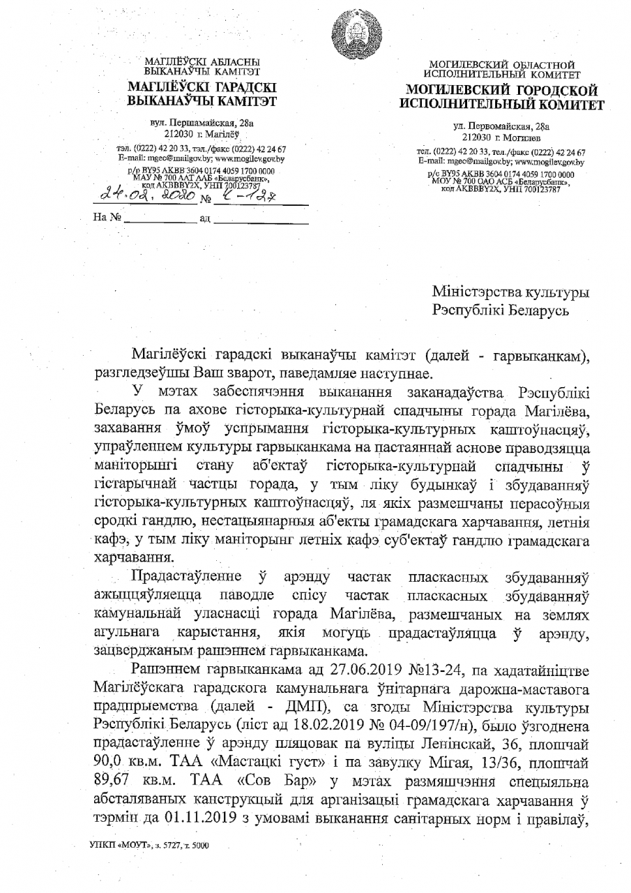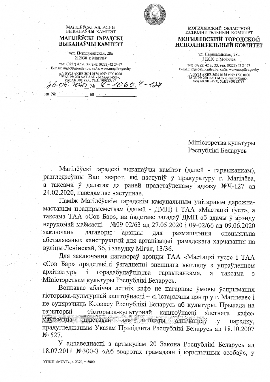 UPD. Вонкавае аблічча летніх кафэ не пагаршае ўмовы ўспрымання гісторыка-культурнай каштоўнасці - "Гістарычны цэнтр у г.Магілёве" і не супярэчыць Кодэксу аб культуры. Прылада на тэрыторыі гісторыка-культурнай каштоўнасці "летняга кафэ" з`яўляецца падставай для выплаты адлічэнняў у парадку, прадугледжаным Указам Прэзідэнта ад 18.10.2007 №527.