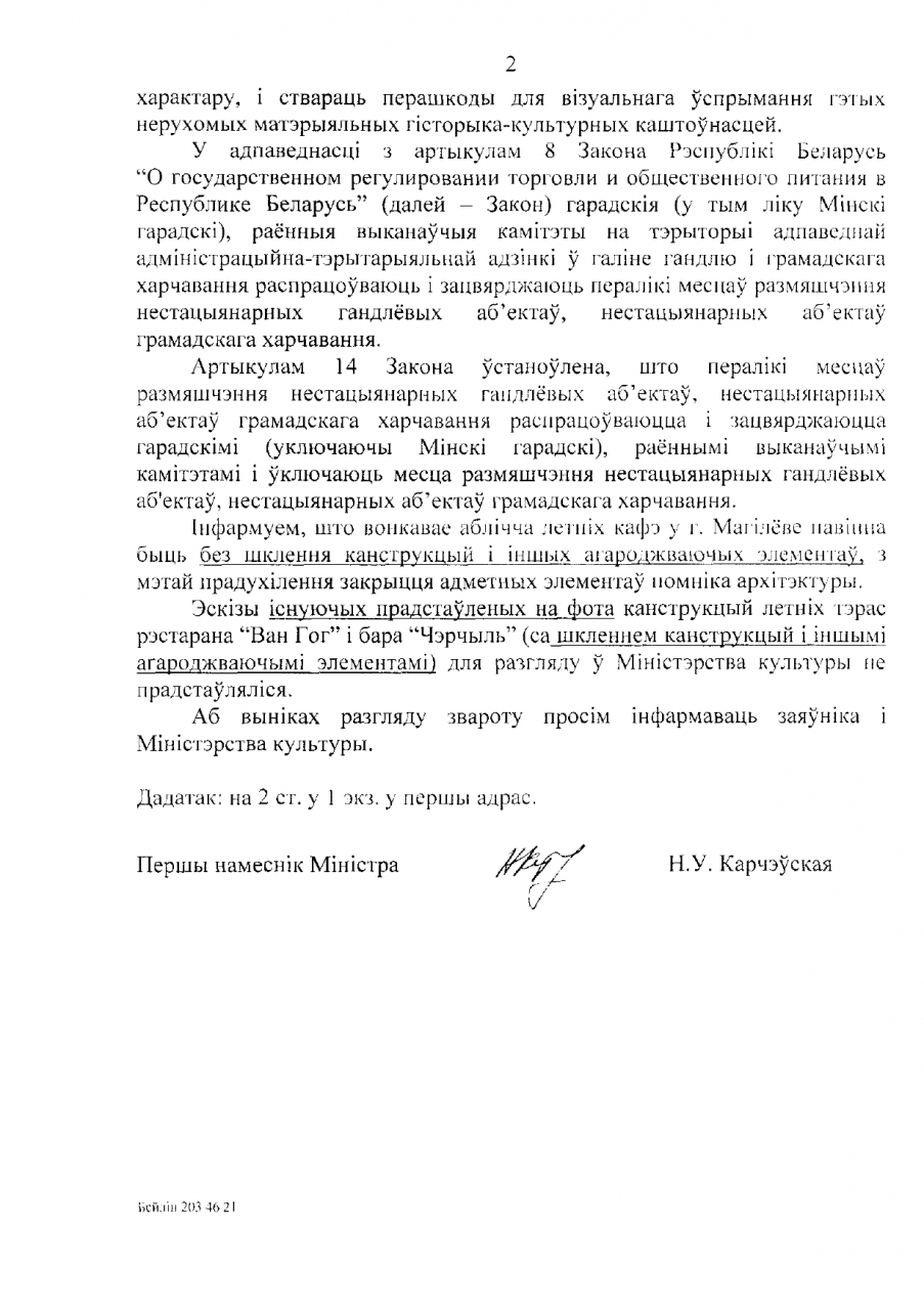 Вонкавае аблічча летніх кафэ ў Магілёве павінна быць без шклення канструкцый і іншых агароджваючых элеметаў. Эскізы інснуючых, прадстаўленых на фота канструкцый летніх тэрас, для разгляду ў Міністэрства культуры не прадстаўляліся. Зварот накіраваны ў Магілёўскі гарвыканкам з просьбай інфармаваць заяўніка і Мінкульт аб выніках разгляду.