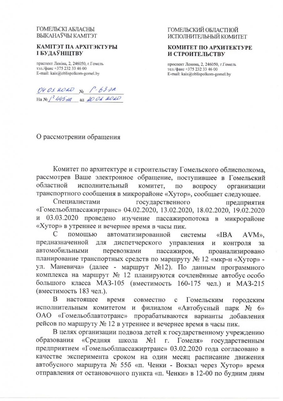 Несмотря на огромное количество писем и жалоб, мы продолжаем считать, что проблема с транспортом в микрорайоне "Хутор" города Гомель по-прежнему остаётся не решена на должном уровне. Так как ровным счётом ничего не изменилось, за исключением пару добавленных рейсов маршрута 12 и 58, но они не решают проблему.