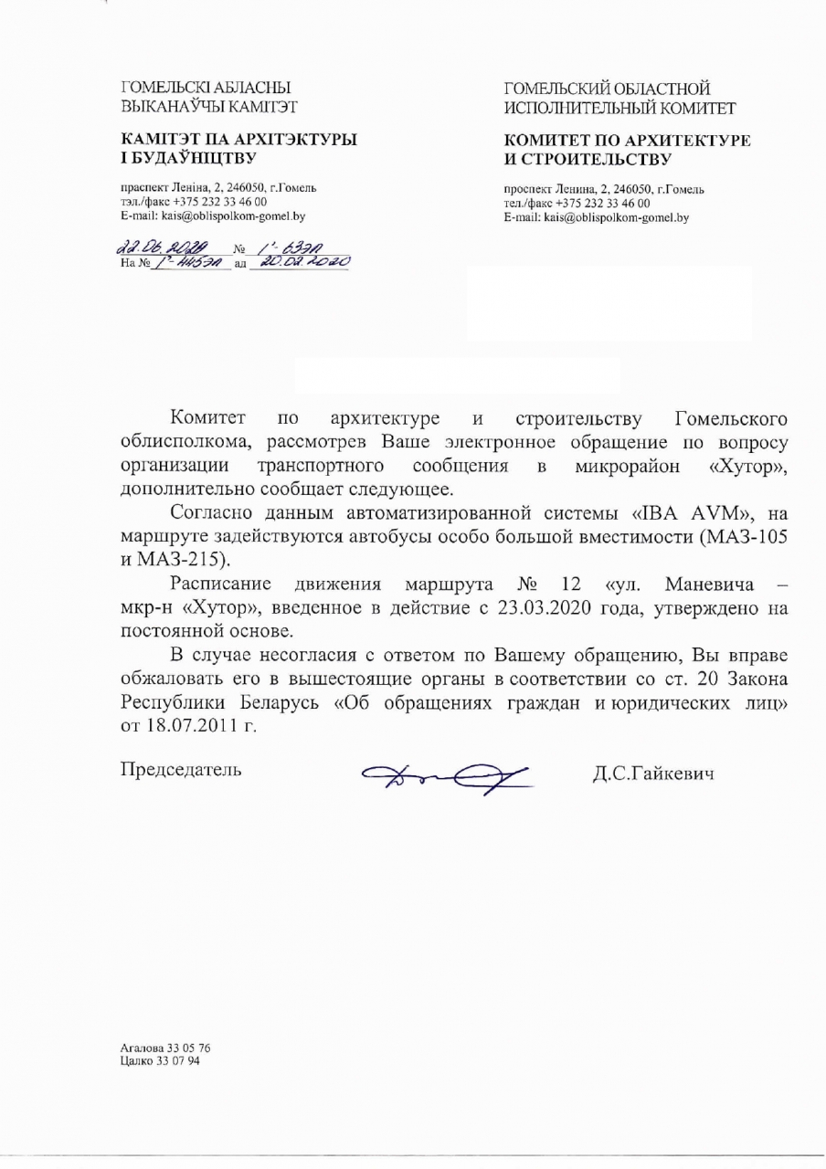 134 рейса в день по маршруты №12 "ул. Маневича- мкр-н "Хутор"", однако согласно расписанию, размещённому на официальном сайте "Гомельоблпассажиртранс" и расписанию на автобусных остановках по данному маршруту в указанном направлении от остановки ул Маневича осуществляется 64 рейса, а в направлении мкр-н "Хутор" - ул. Маневича 70 рейсов, на данном маршруте работает 70 автобусов. С автобусной остановки "Хутор" в направлении к центру города можно уехать только на 70 рейсах.