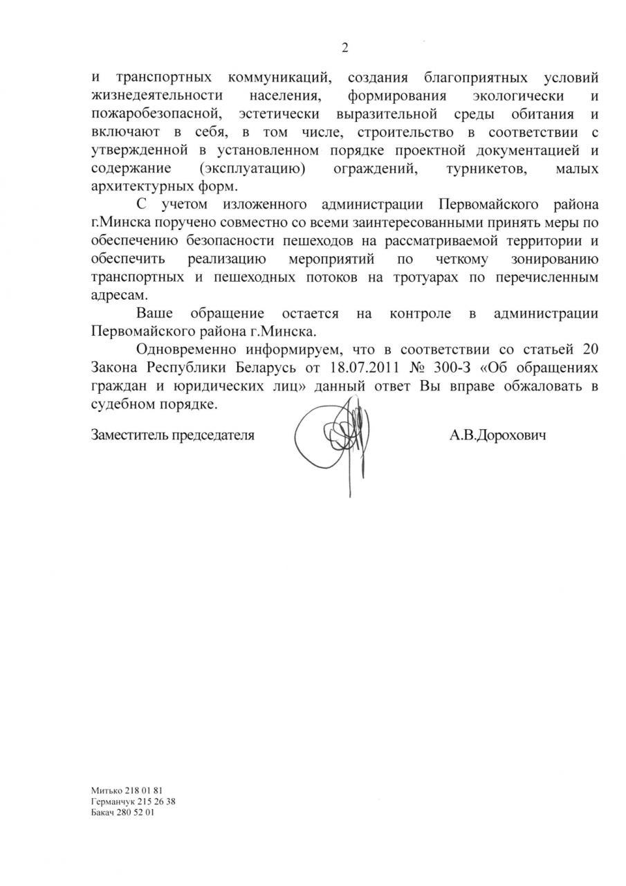 Администрации Первомайского района г.Минска поручено совместно со всеми заинтересованными принять меры по обеспечению безопасности пешеходов на рассматриваемой территории и обеспечить реализацию мероприятий по чёткому зонированию транспортных и пешеходных потоков на тротуарах по перечисленным в обращении адресам.